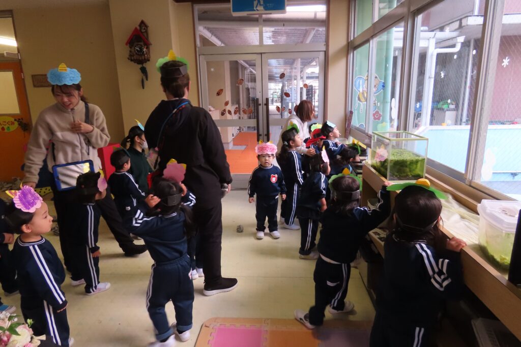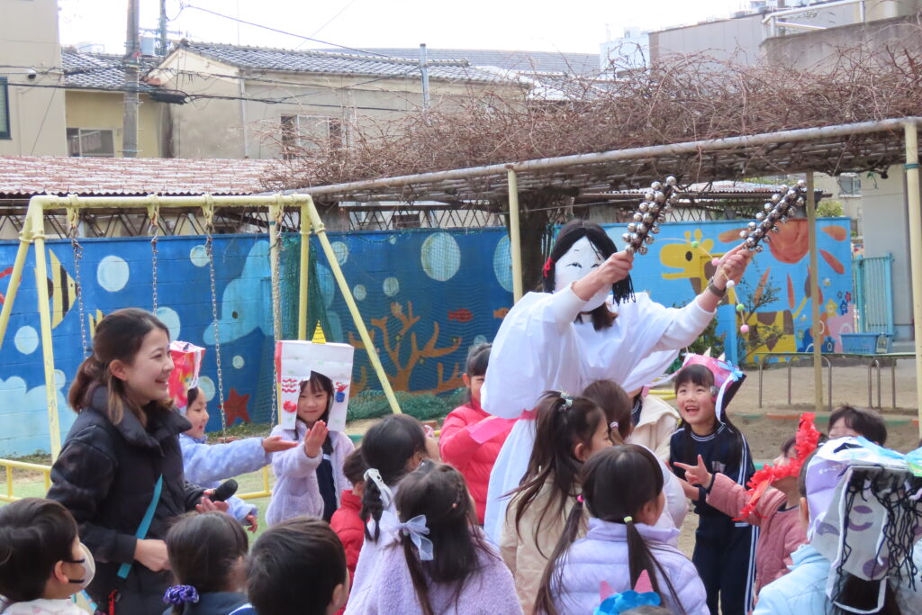節分のいわれや豆まきの意味を子どもたちに説明した後、どこからか太鼓の音が…!