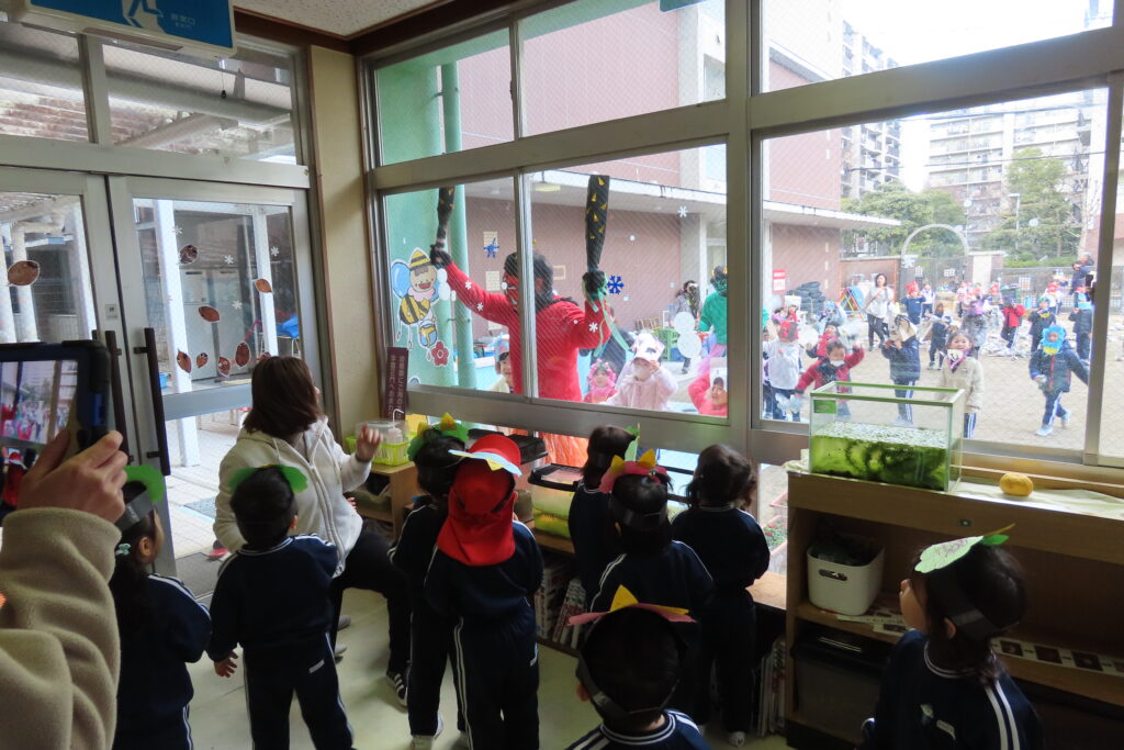2歳児・満3歳児クラス「りんご組」の友だちは、ドアをしめ切って、園の中(廊下)から見学していましたが、鬼が近寄ってくると 泣き叫ぶ子も続出して大騒ぎ。(いっしょに園庭で豆まきをしなくて正解でした。)