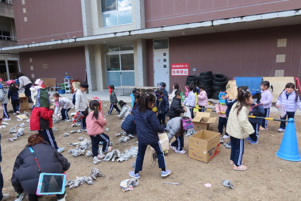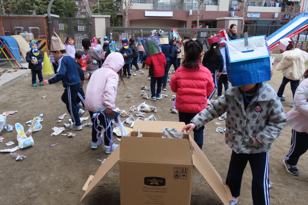 鬼さんをやっつけた後は、みんなで後片付け。新聞紙の豆を拾いました。