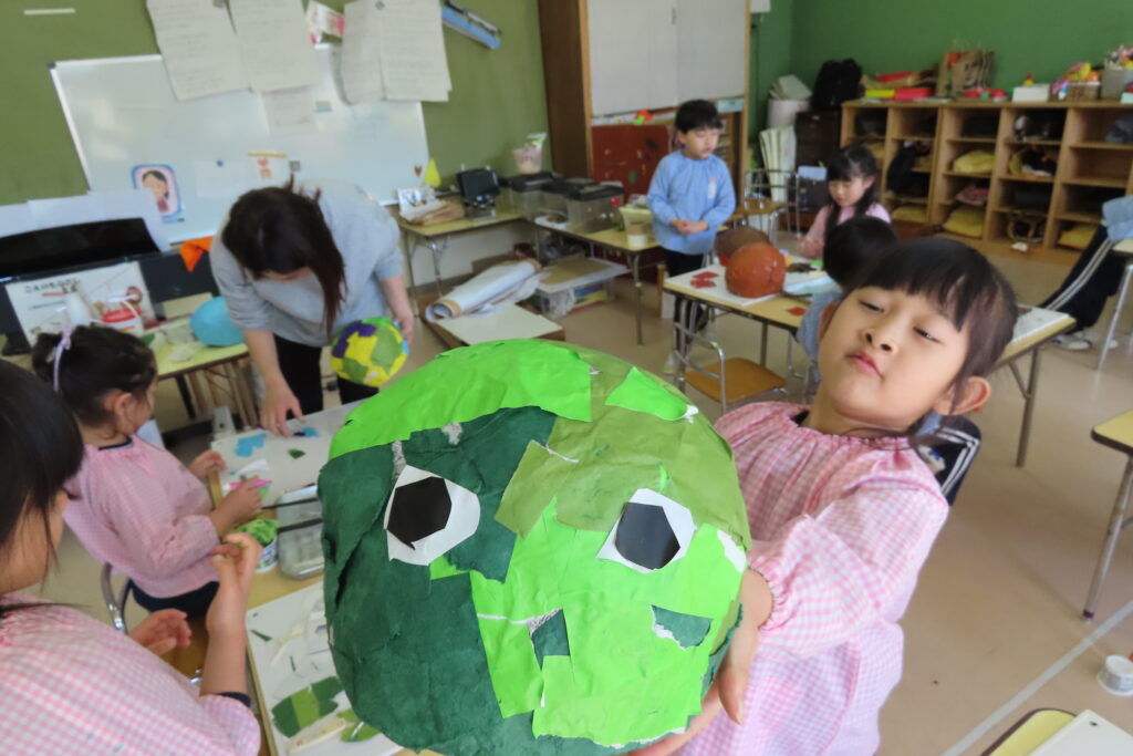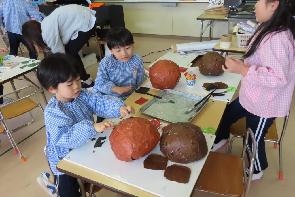 まずは年長「つき組」さん。作っているお面は、生活発表会の劇『あしたもともだち』に出てくる登場人物です。みんな、何になるのかな?