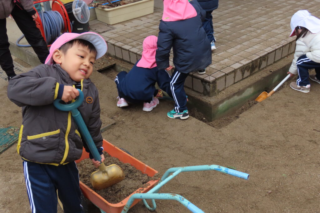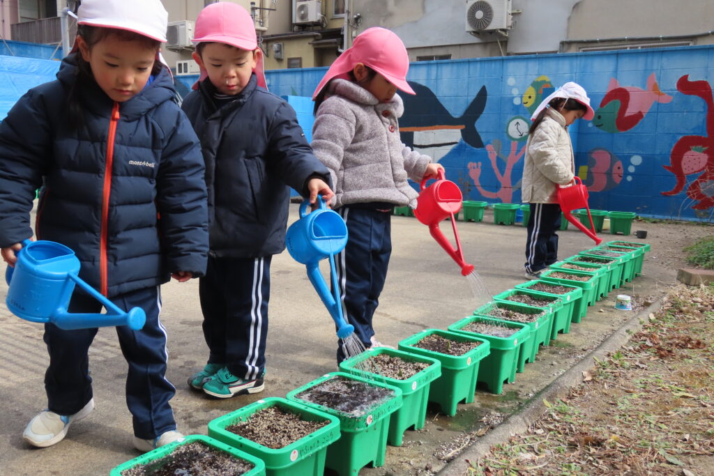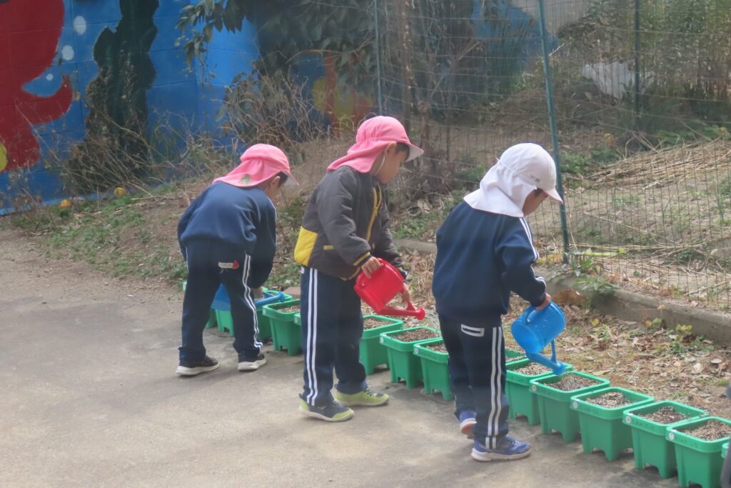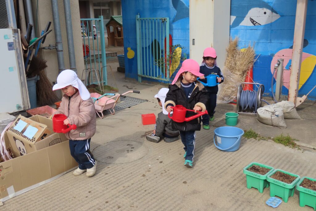 年少「さくら組」さんは、チューリップに水やりをした後、こんなことが始まりました。