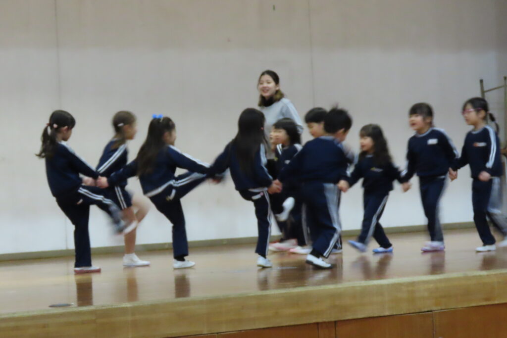 年中「ほし組」さんは、体育館で場位置の確認を…。高校生が体育の授業をしている中、少しだけ舞台をお借りして練習していました。