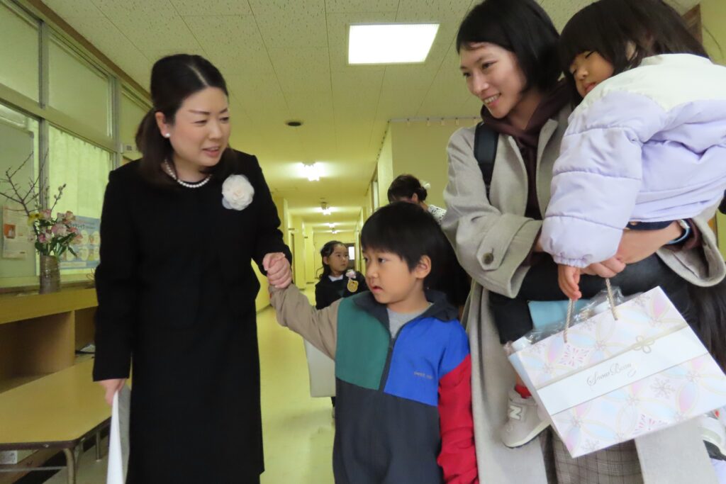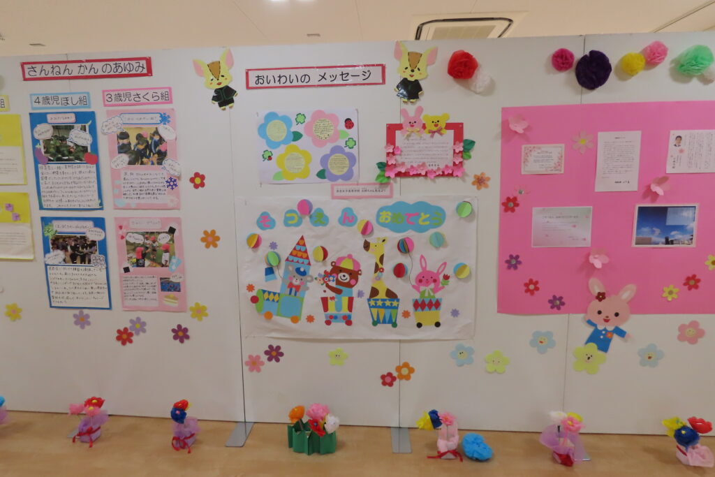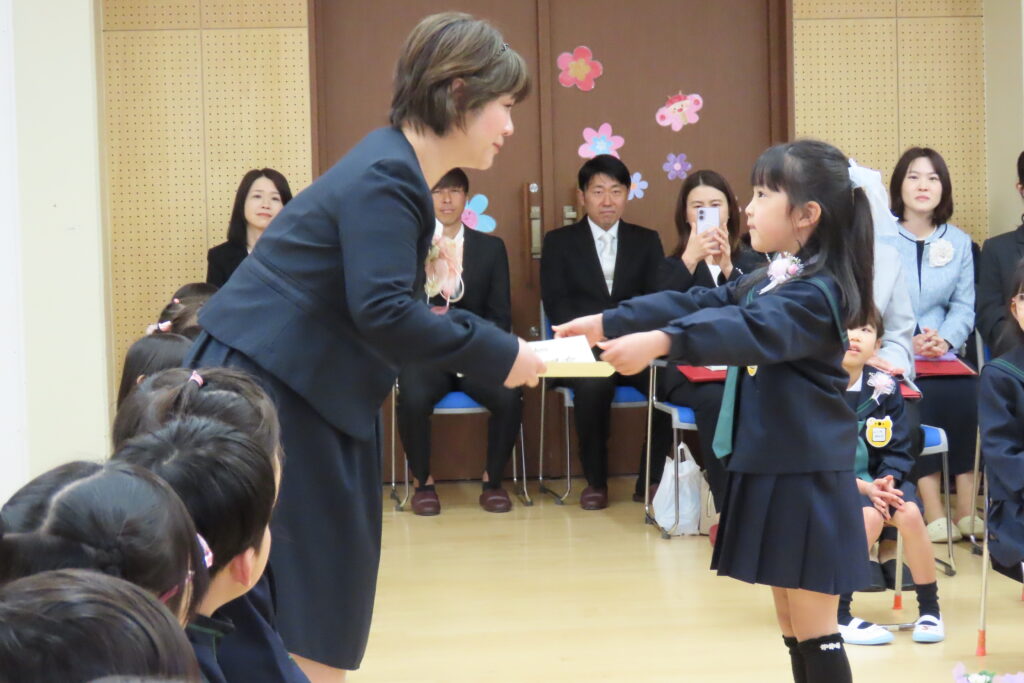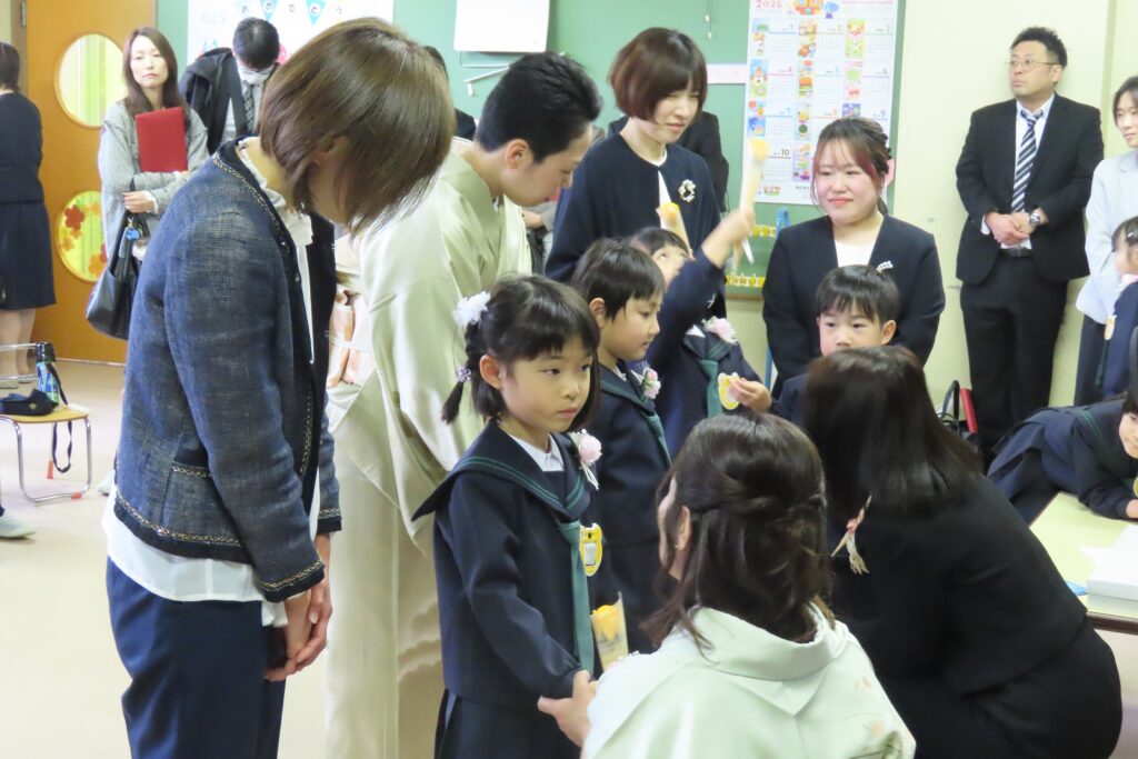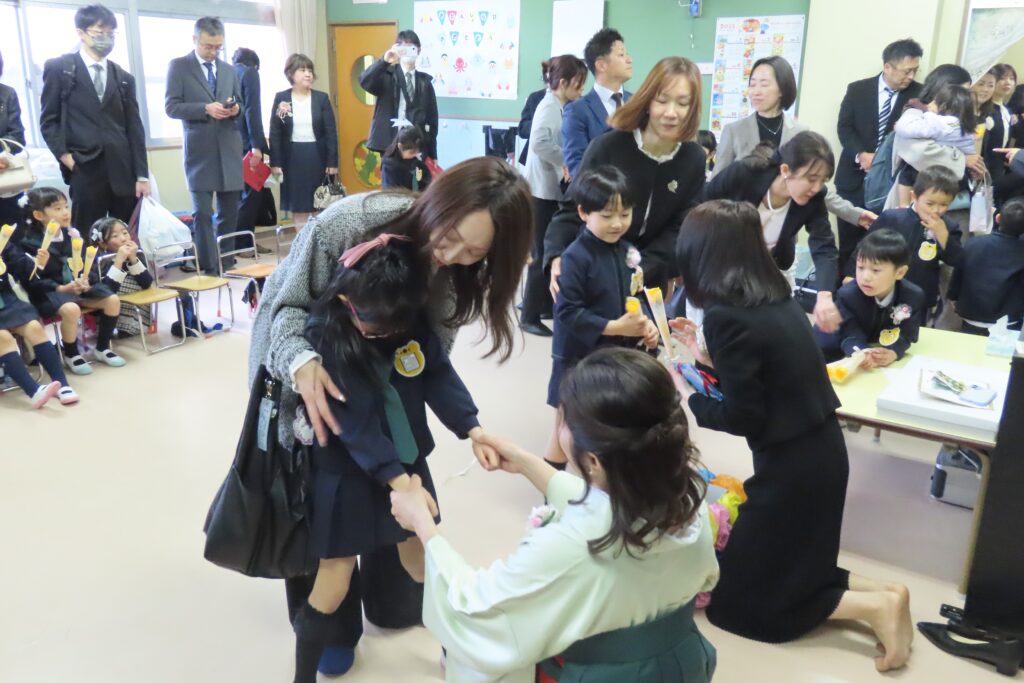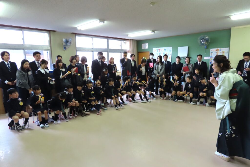 保護者の皆様、本日はお子さまのご卒園、おめでとうございます。そして、長い間、本園の教育・保育にご理解とご協力を賜り、ありがとうございました。私たちは、いつまでもお子様の応援団です。また、幼稚園にも遊びに来てください。(ランドセル姿、見せに来てね!)