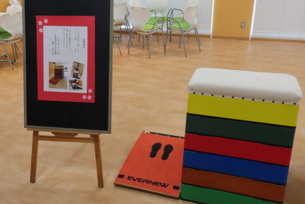 また、卒園児の保護者様からは、卒園記念品として、跳び箱とロイター版を寄贈いただきました。ありがとうございました。大切に使わせていただきます。