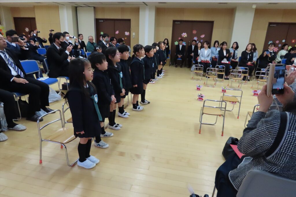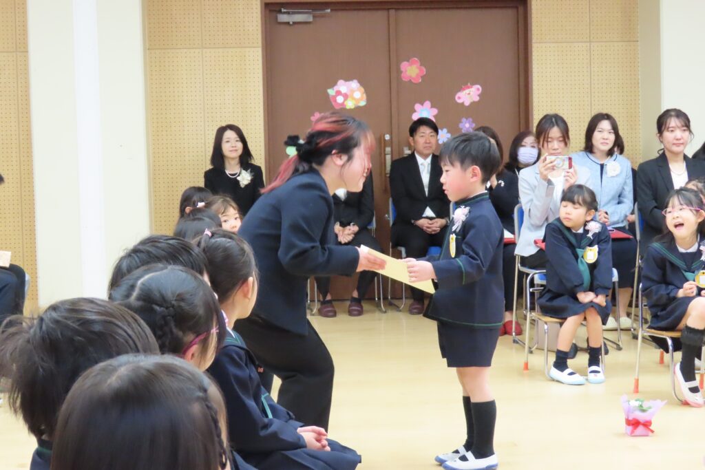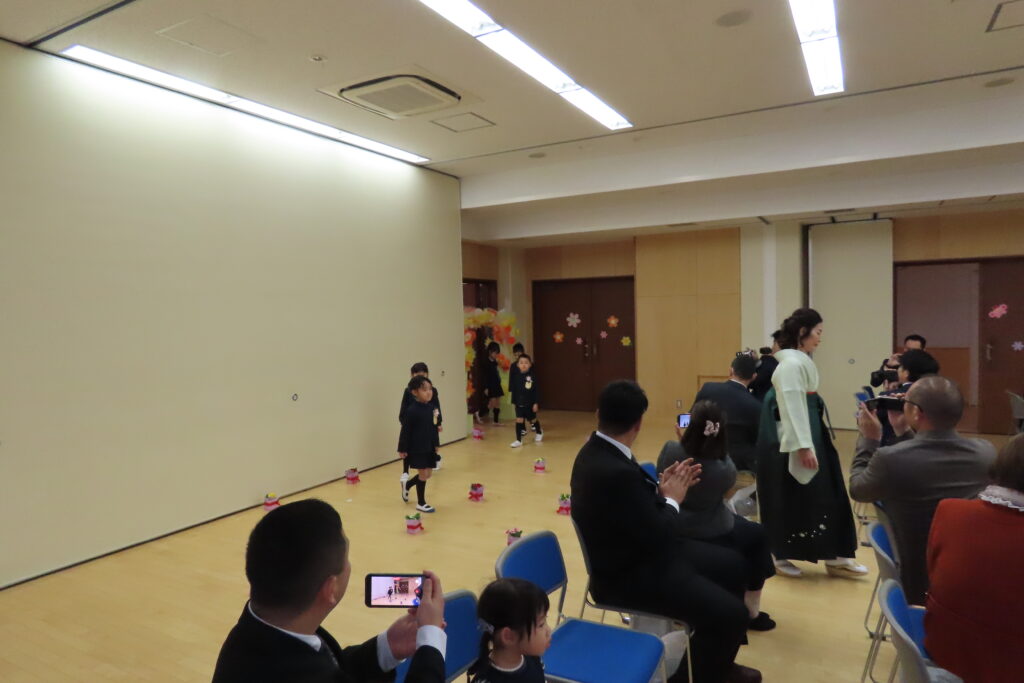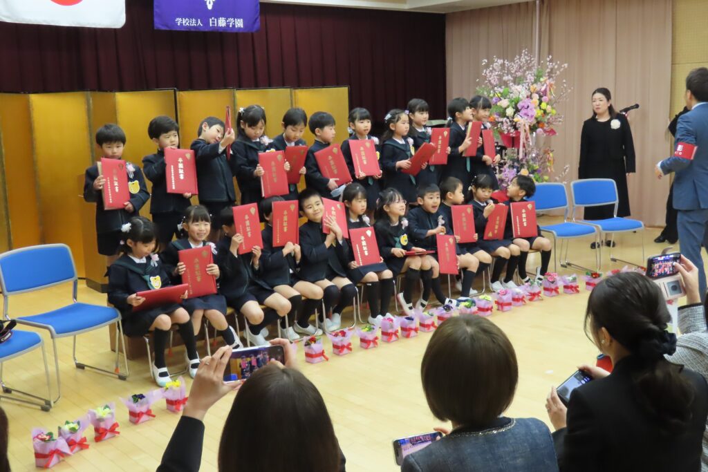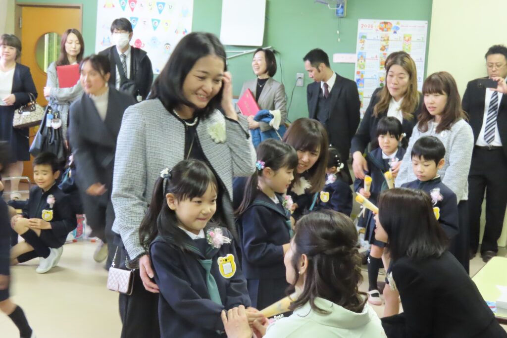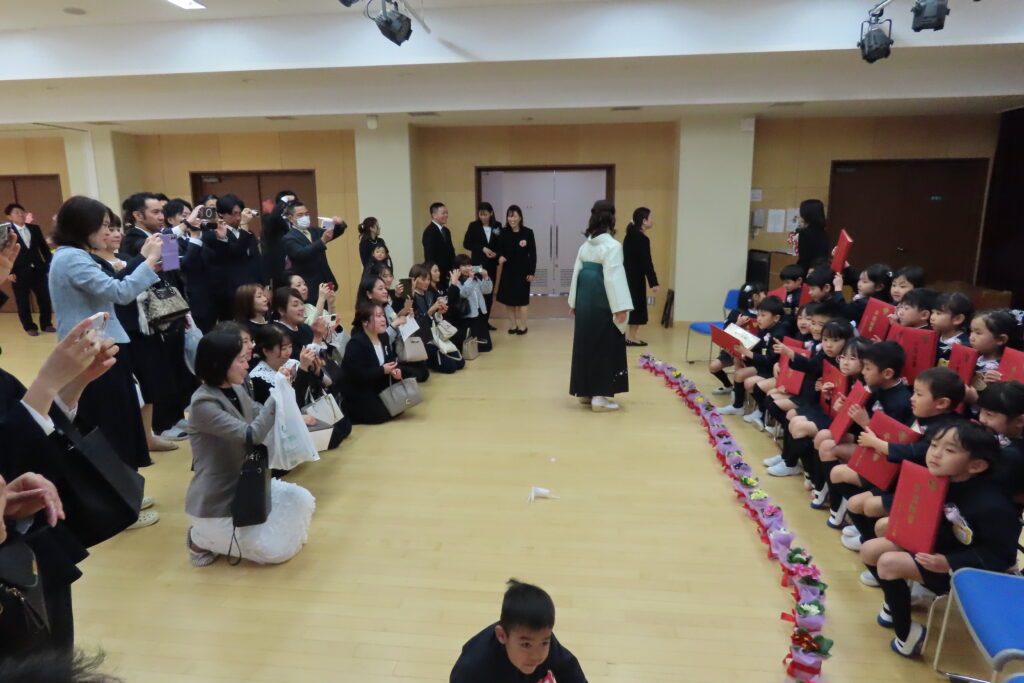と心配された天候も何とかお昼まではこらえてくれて、令和七年度の卒園式を無事終えることができました。保護者の皆様と来賓の方々の温かなまなざしの中、卒園児の皆さんは、一人ひとりとても堂々と、凛々しく修了証書を手にし、来賓の皆様からも「感動した」とおっしゃっていただきました。その様子を、少しご紹介します。