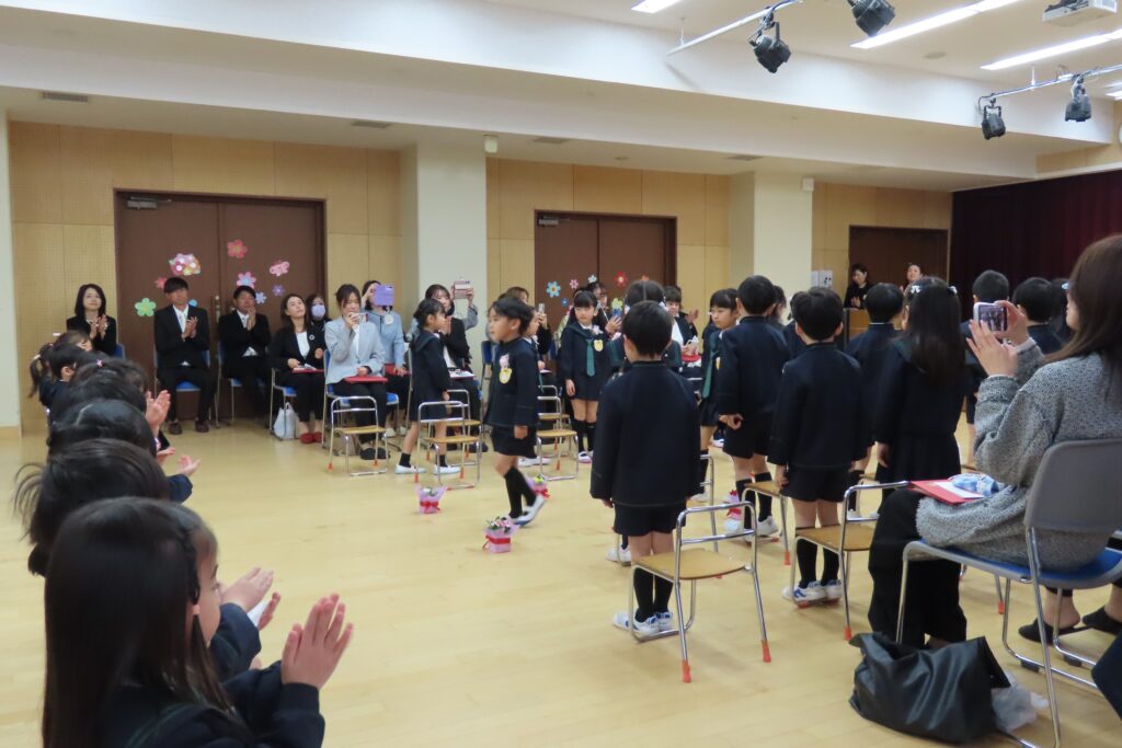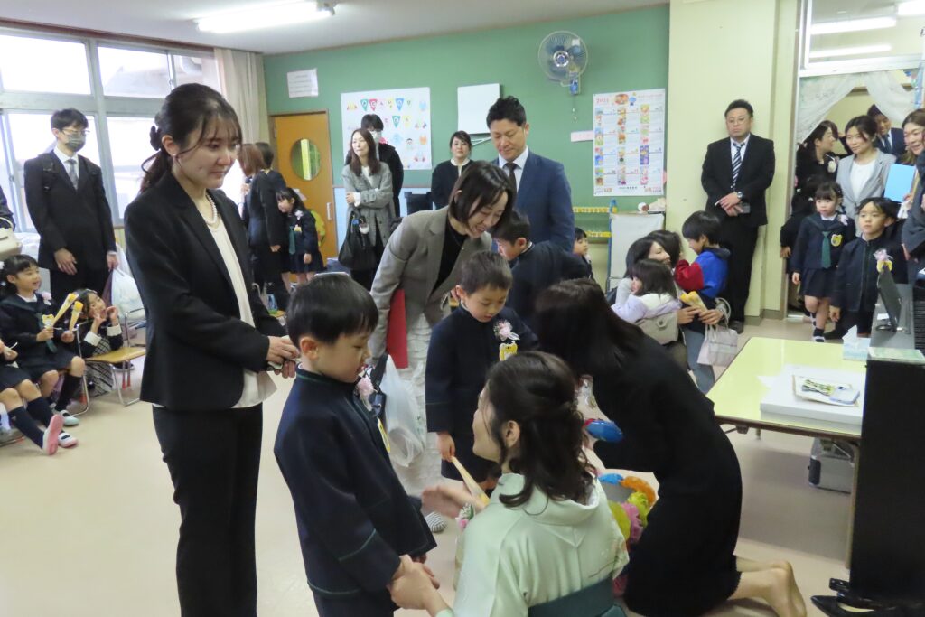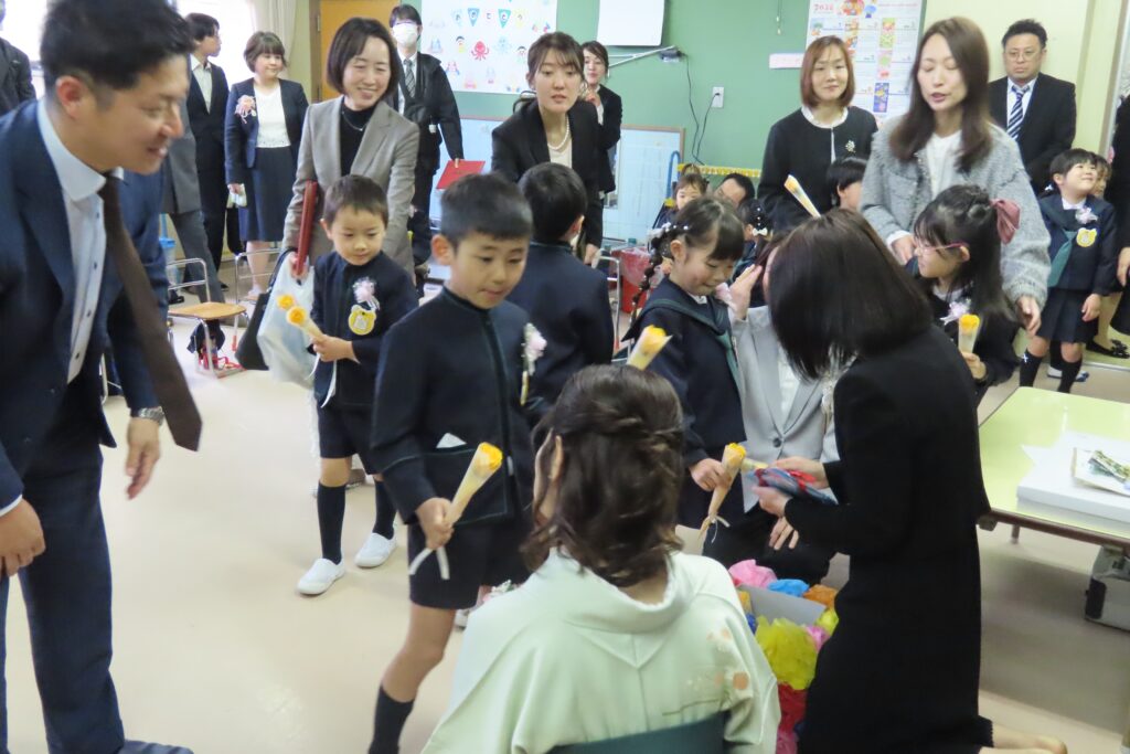 まずは、子どもたちから先生へお花のプレゼント。先生からは思い出やがんばったこと、小学校に向けての期待などを、お子様一人ひとりに伝えていきました。これが最後のお別れの言葉です。