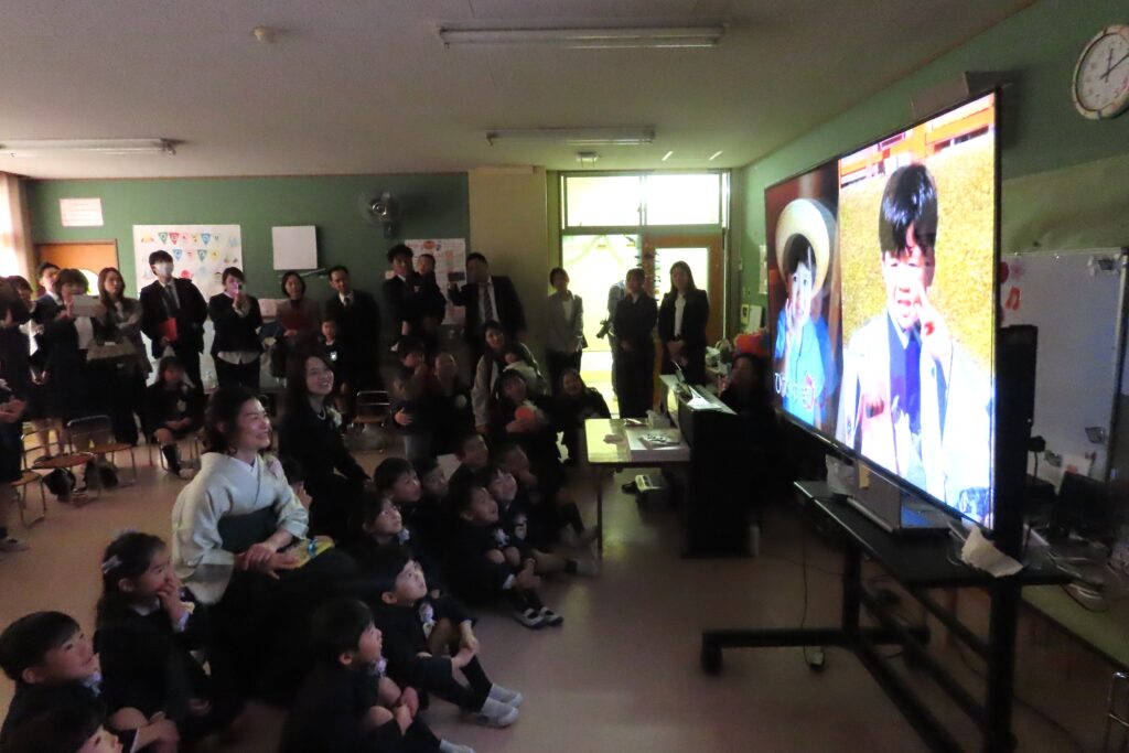 そのあとは、サプライズ第2弾のスライドショー。子どもたちの成長の様子を年少のときの写真と年長のときの写真とを並べて振り返っていきました。懐かしい写真も登場して、みんな嬉しそうに見ていました。