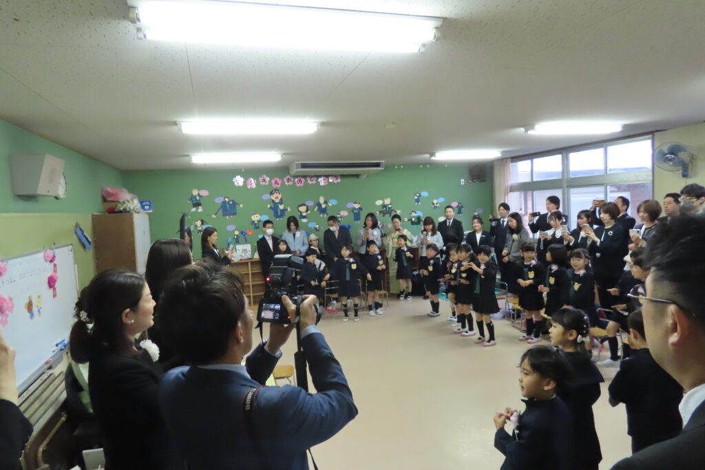 この日は、9月に滋賀県へ転園していったお友だちも来てくれました。転園先の幼稚園の卒園式は昨日だったそうで、今日はこちらの卒園式には出席できませんでしたが、式後の保育室でのお別れセレモニーから参加してくれました。遠く離れた小学校に通うことになりますが、いつまでも元気で頑張ってください。