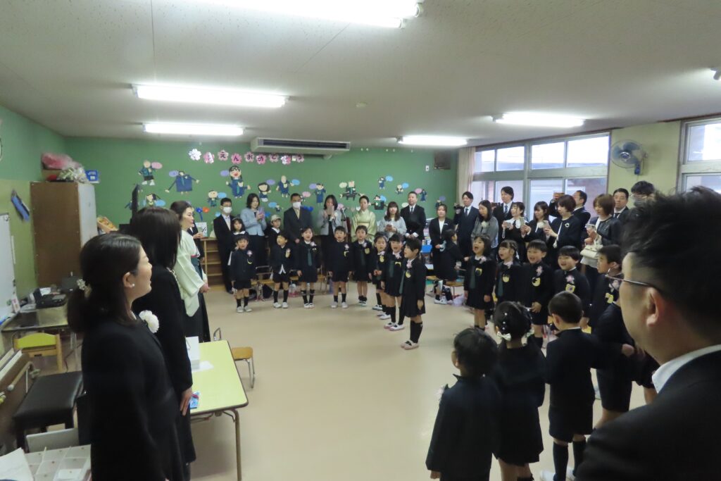 最後は、いつもうたっている「お帰りの歌(?/題名不明)」の卒業式替え歌Verで歌って明るく幕を閉じました。外では、少し雨も降りかけていましたが、大好きな園庭でしばらくの間、名残を惜しんでいました。
