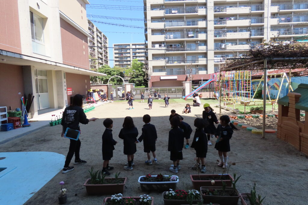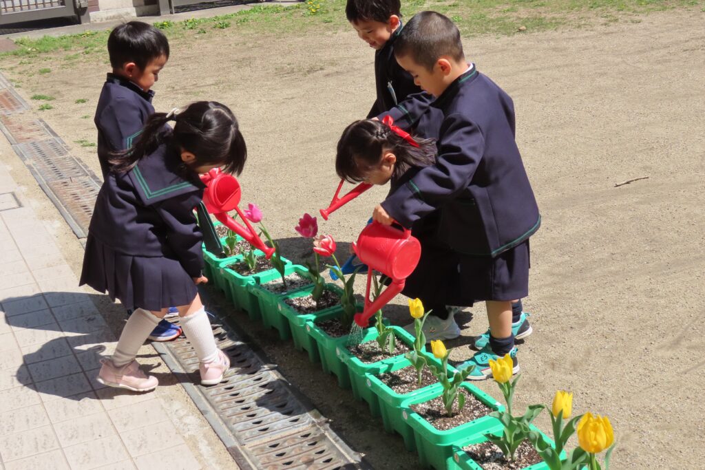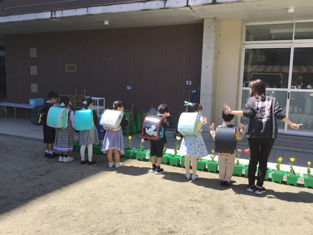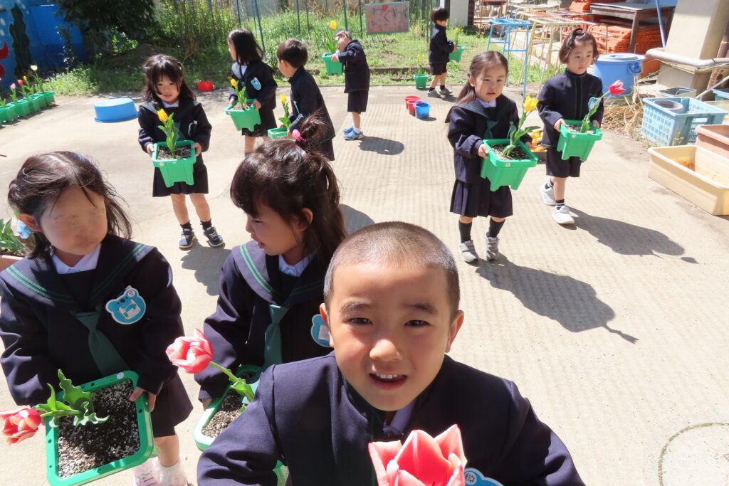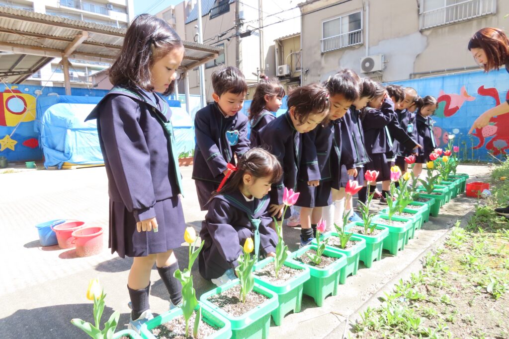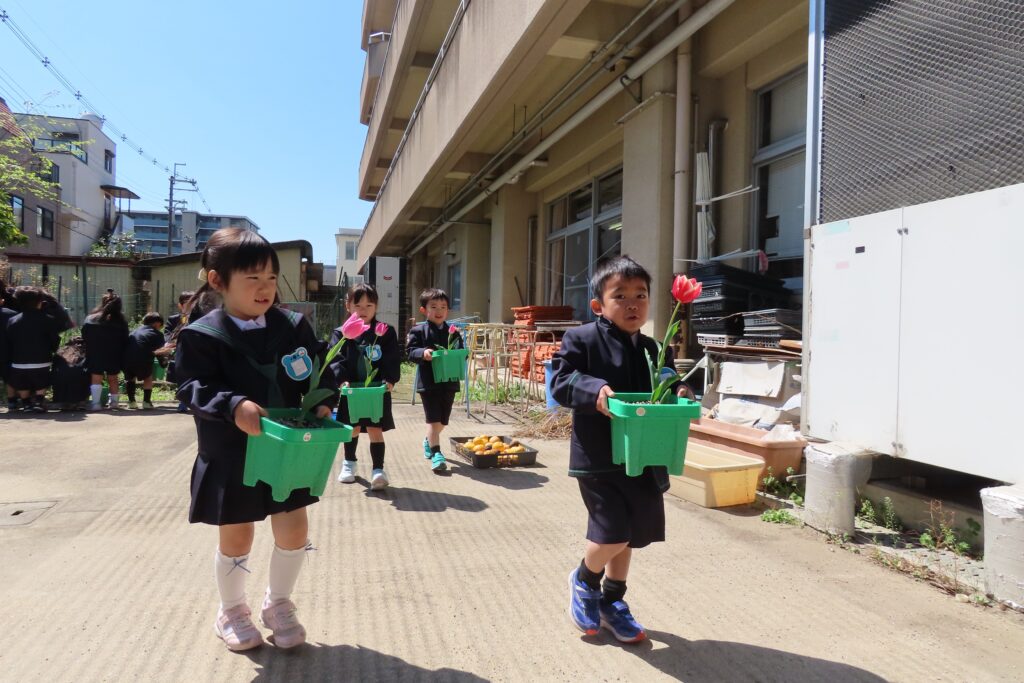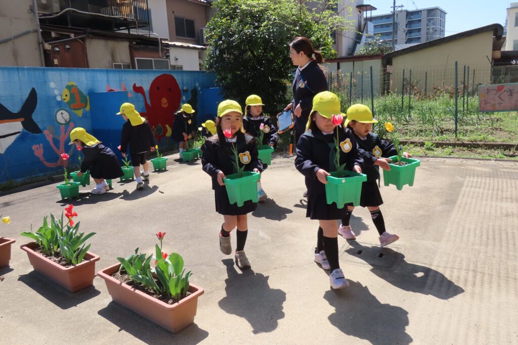 そのあとは、育てているチューリップの鉢植えを、園庭の日当たりのいい場所に移動させました。歌のように、赤・白・黄色やピンクの花がきれいに咲いています。