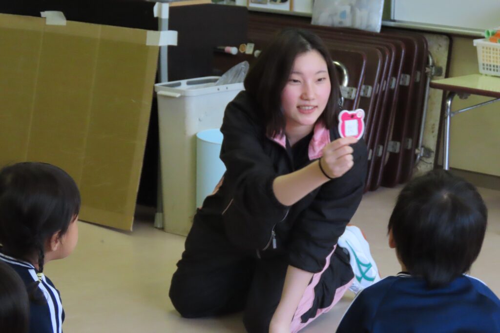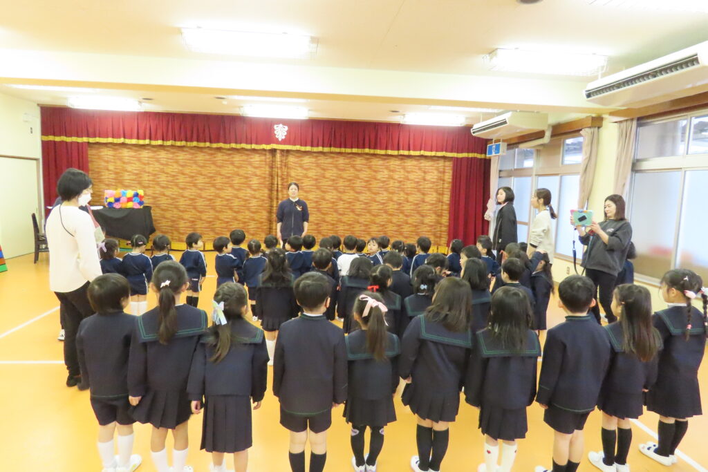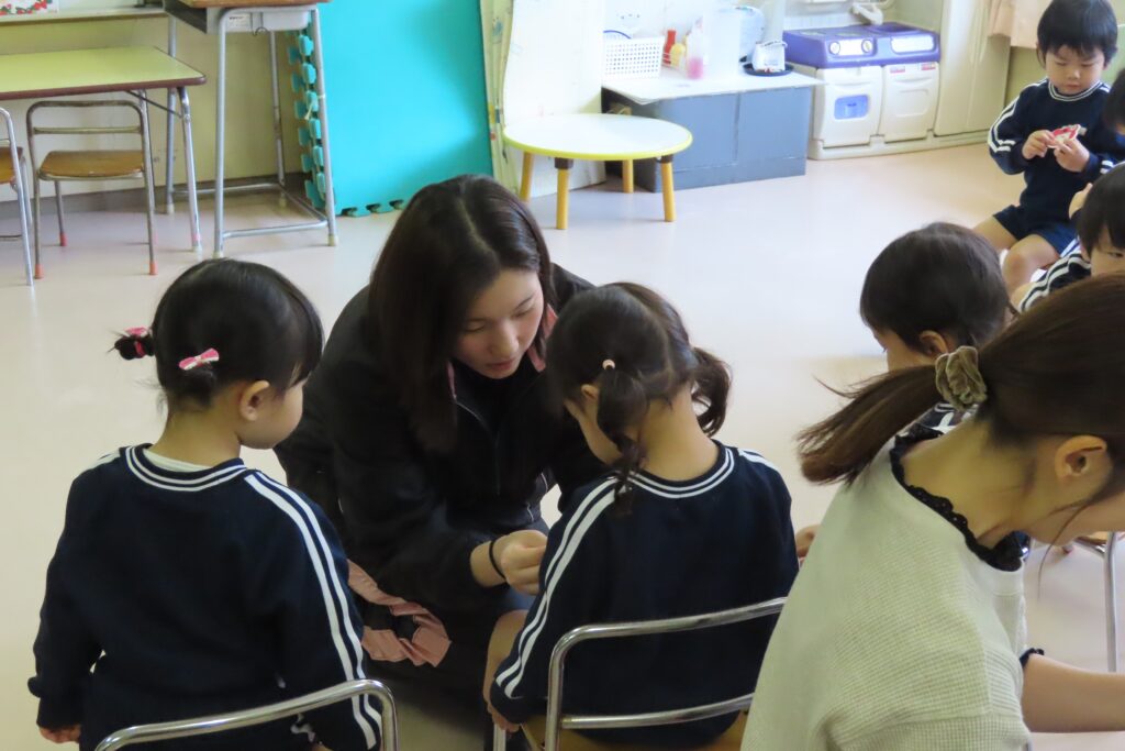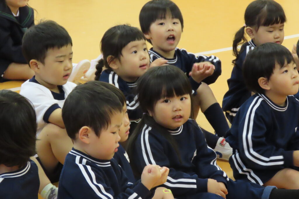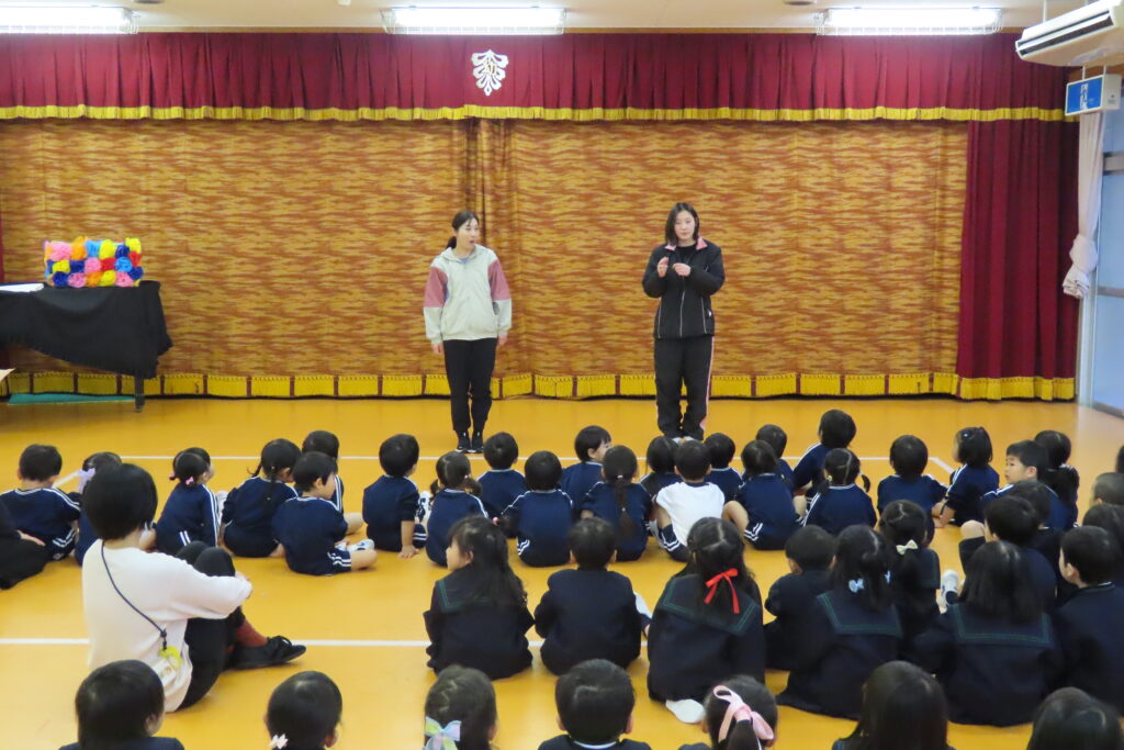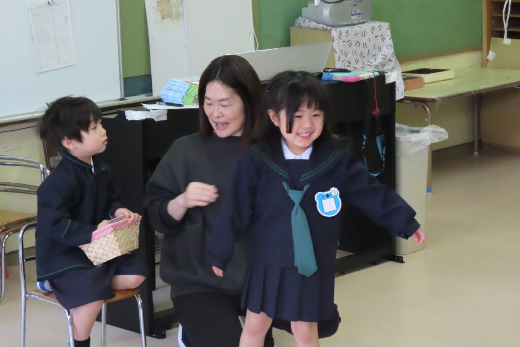 最初に元気よく朝のご挨拶をしたあと、新しい先生の紹介です。保育学院からフレッシュな二人の先生をお迎えしてのスタートです。自己紹介の後は、子どもたちと手遊び歌で楽しみました。