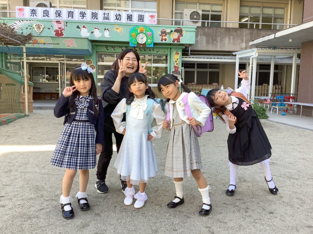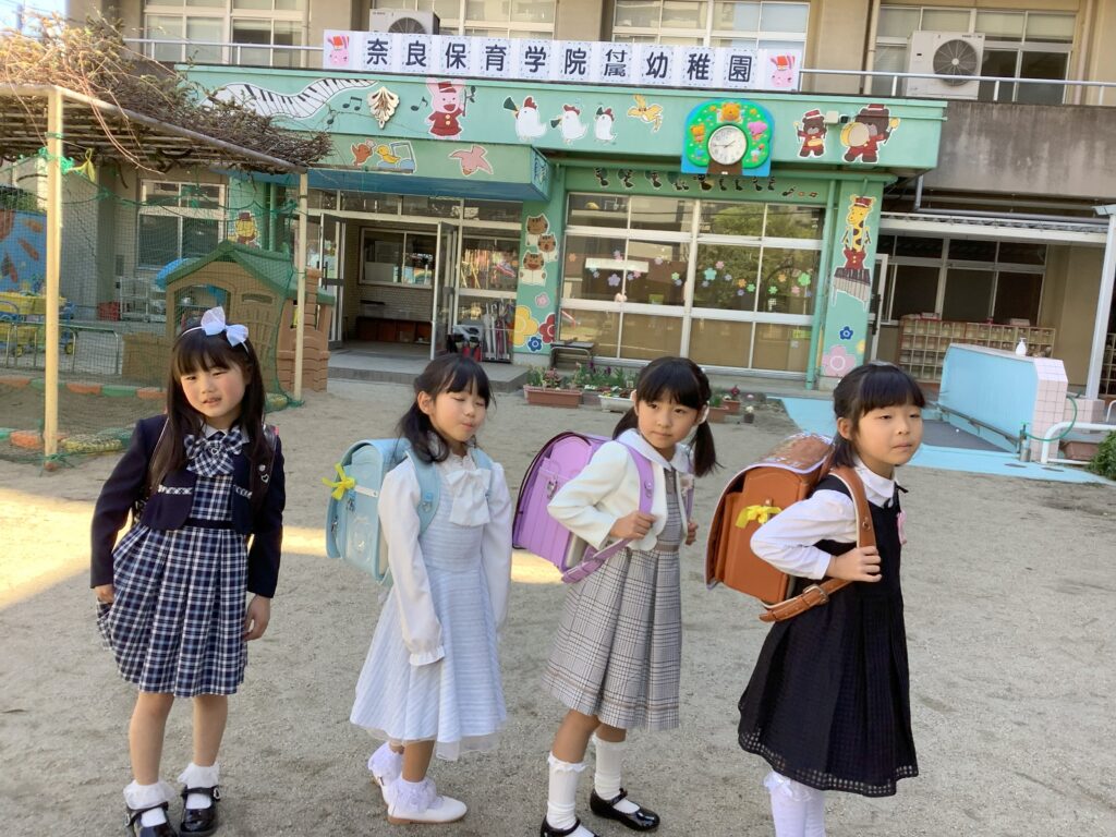 今日は奈良市の公立小学校の入学式がありました。卒園生が、入学式の服と自慢のランドセルを見せに来てくれました。