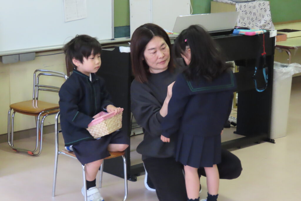これは、奈良女子高校保育コースのお姉ちゃん先生から新入園児「さくら組」の皆さんへのプレゼント。お姉ちゃん先生の代わりに幼稚園のお姉ちゃん(とお兄ちゃん)の「つき組」さんが「さくら組」さんにプレゼントしてくれました。