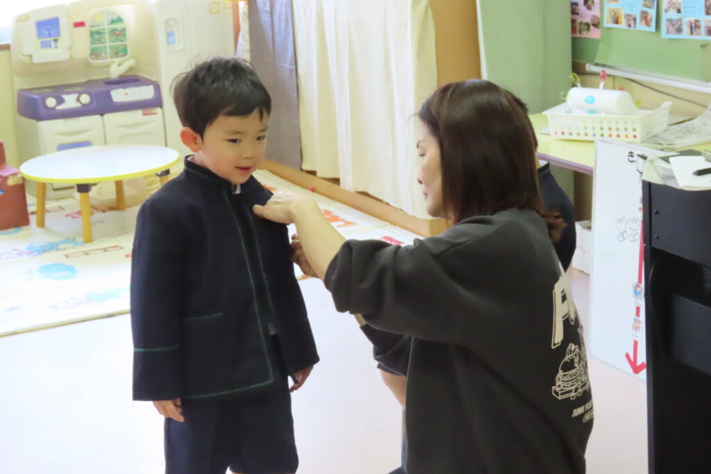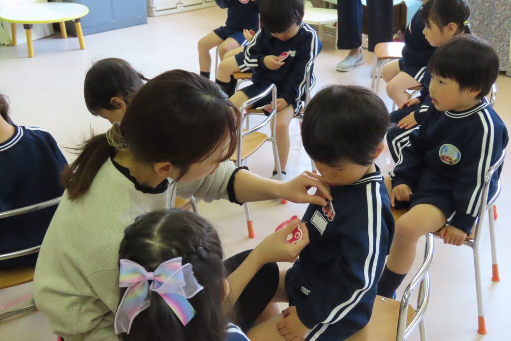 始園式の後は、園長先生からいただいた新しい名札を担任の先生につけてもらいました。ひとつ上の学年の色になって、うれしいね!