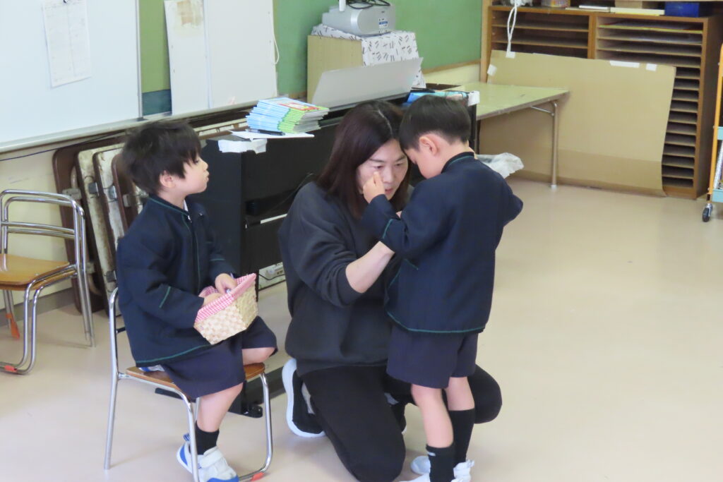 年少「さくら組」さんは、お帰りの前に、一人ひとり名札を付けてもらいました。「さくら組」さんは5月の連休明けまでは体操服登園です。もらった名札は連休明けの制服のときから活躍します。それまでは大事にしまっておいてね…。