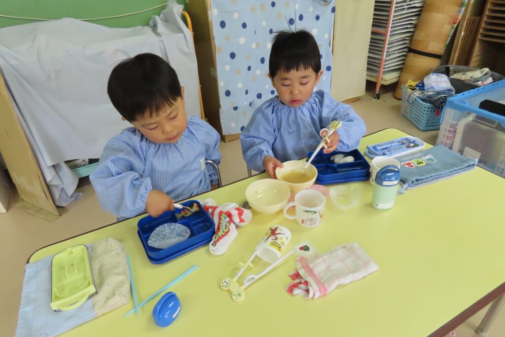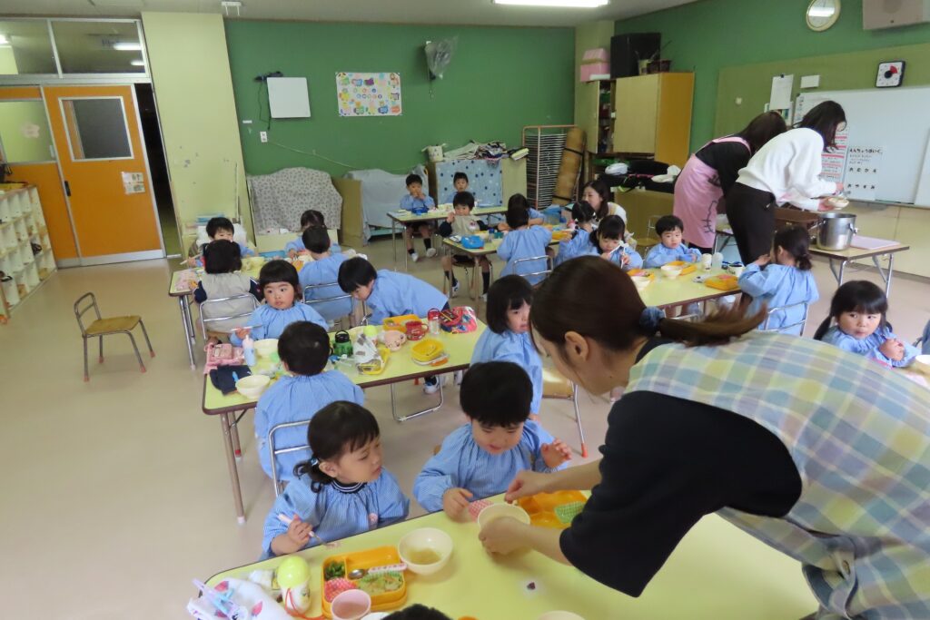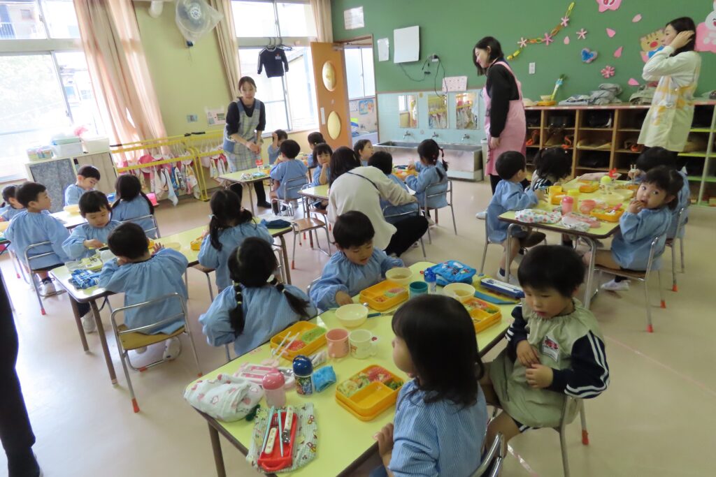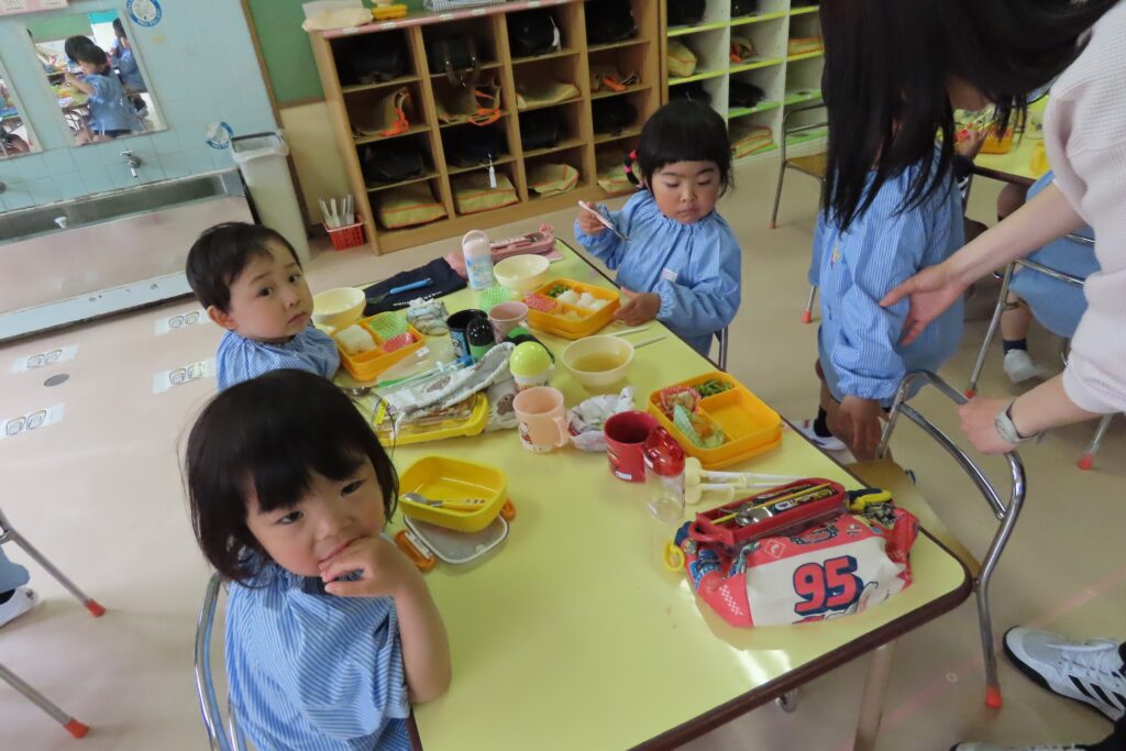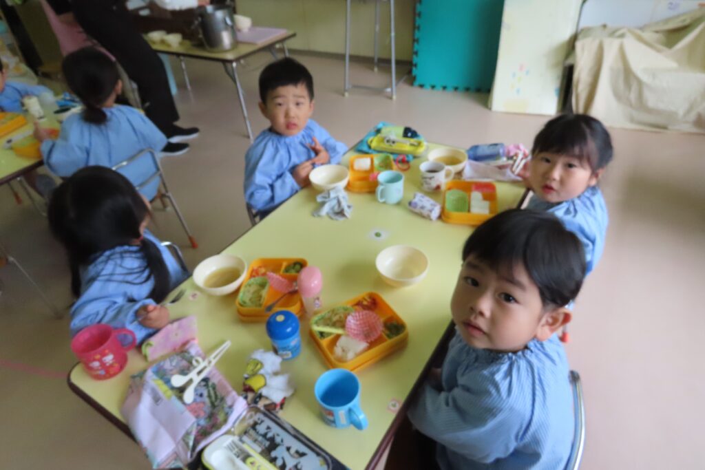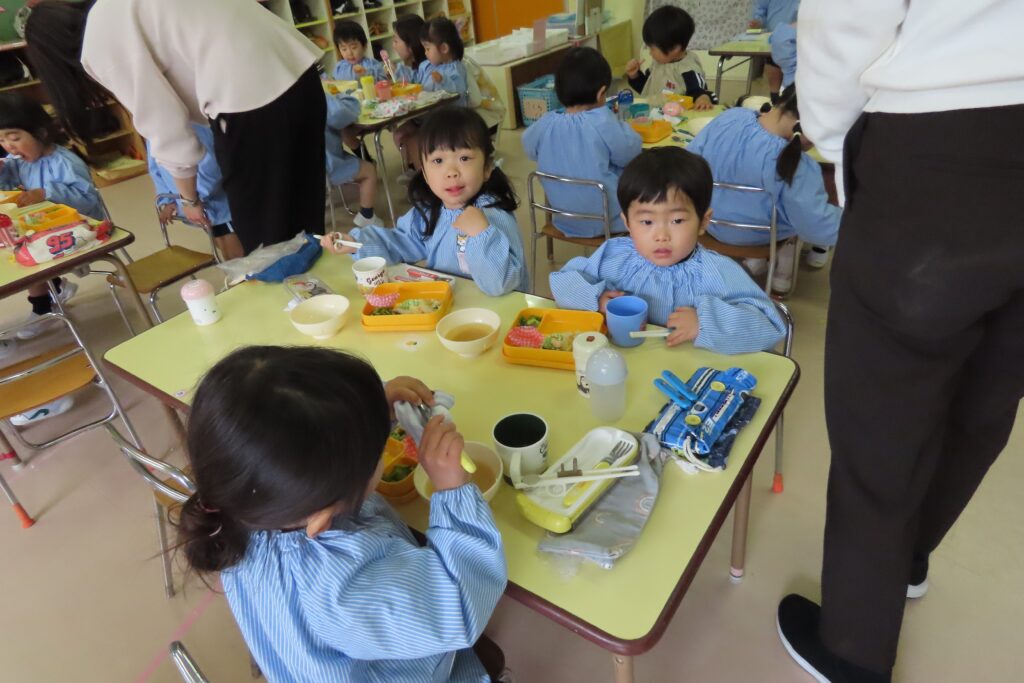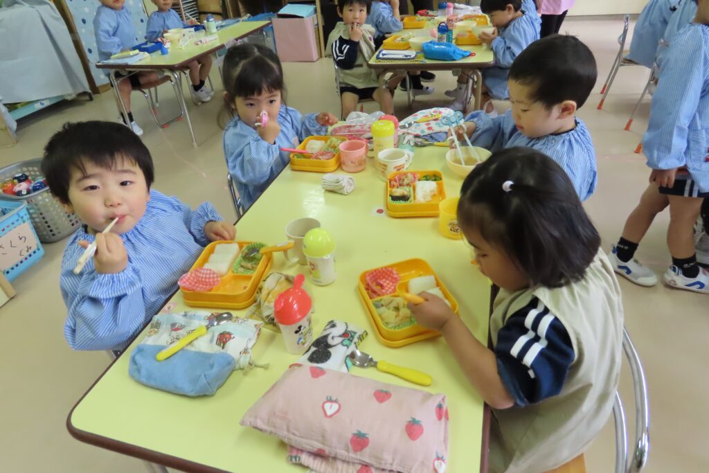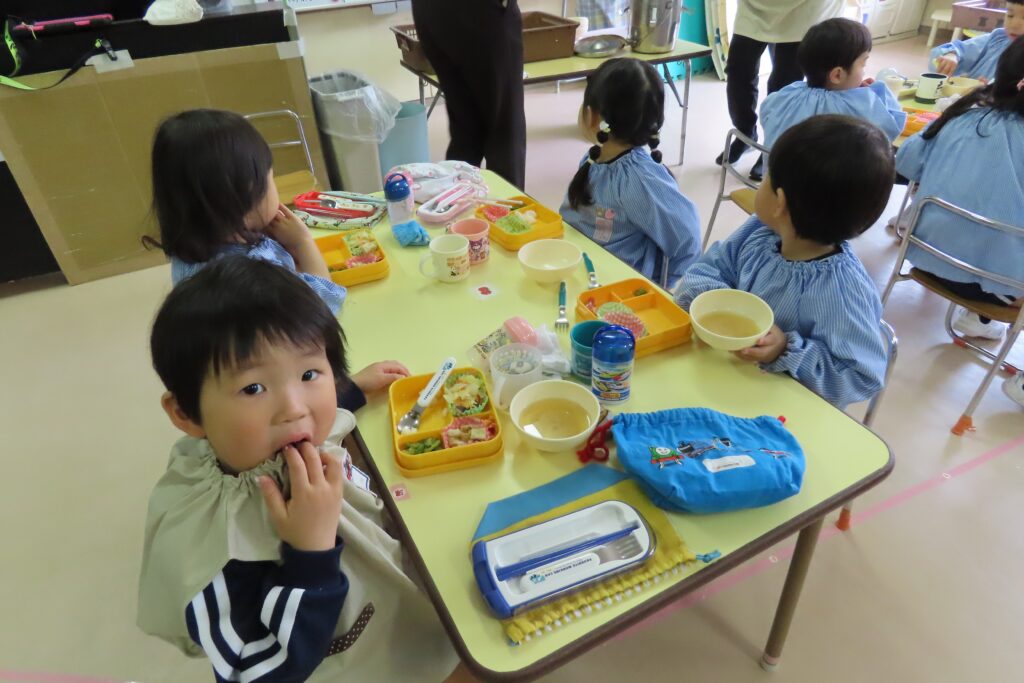 年少「さくら組」さんは、はじめてのみんなそろっての給食です。でも、みんな上手に食べていました。これからも、好き嫌いなく、がんばって食べようね。