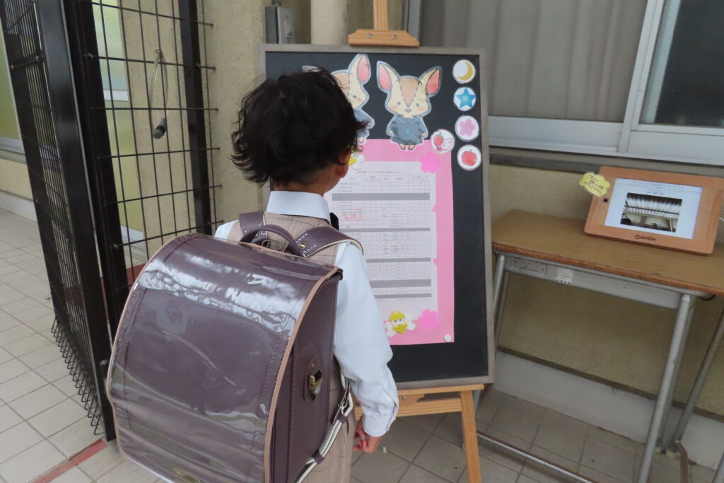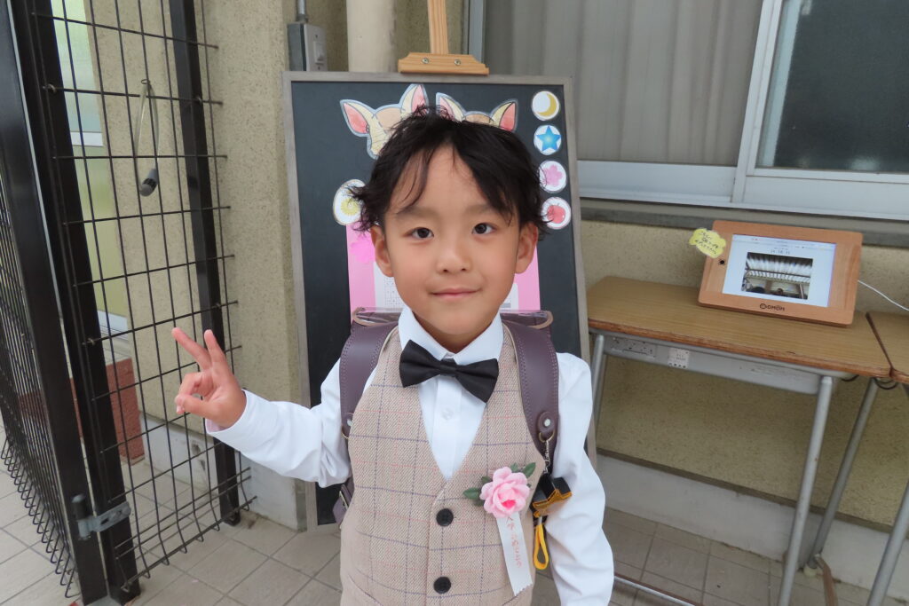 昨日は奈良市立の小学校の入学式でしたが、今日は木津川市立の小学校の入学式。木津川市から通園してくれていた子が『入学おめでとう』のリボンもつけてやってきてくれました。ピカピカの一年生! 楽しい小学校生活、送ってね!