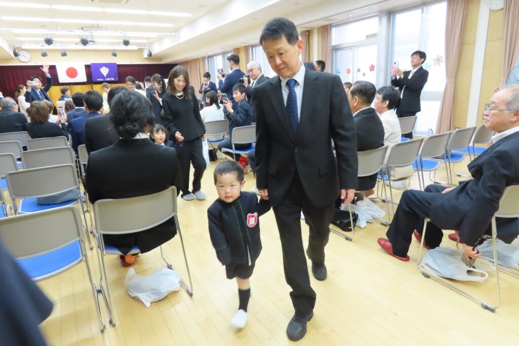 記念写真の後は、クラスで担任から挨拶をさせていただき、いつものようにお帰りの歌を歌いました。今日が入園式ですが、多くのお友だちは去年は「りんご組」として、また今年も4月8日から登園してきています。ですので「いつものように…」挨拶をしましたが、今日が「はじめまして」のお子様は初体験。月曜日から、みんなと一緒に楽しく遊ぼうね。