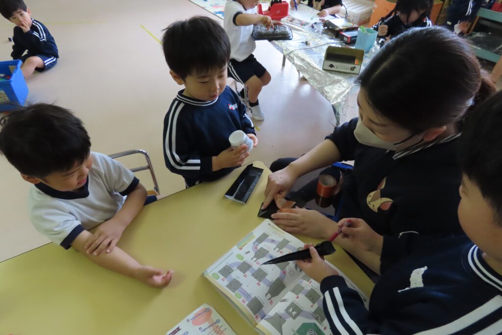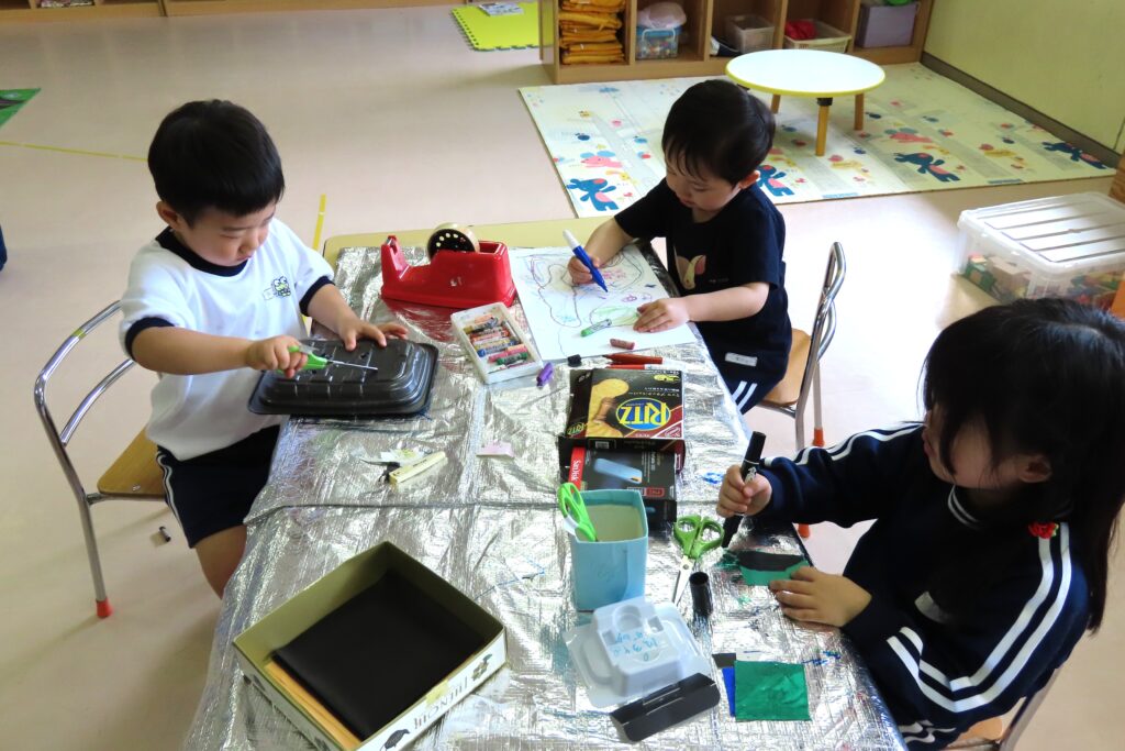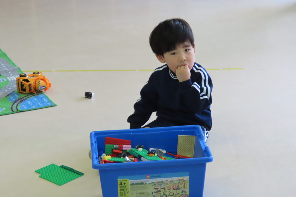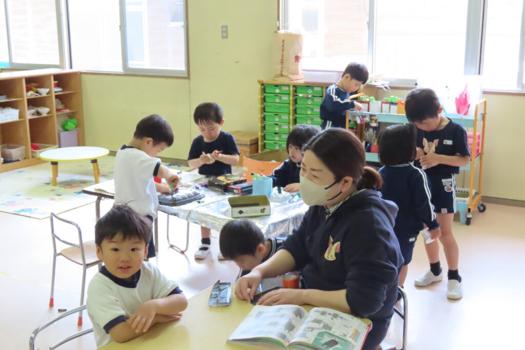 自由登園日には、今日は9人のお友だちが来てくれました。土曜日は、みんなそろっての遊びです。今日は保育士試験がありましたので、園庭で遊ぶことができず、年長さんの保育室で遊びました。