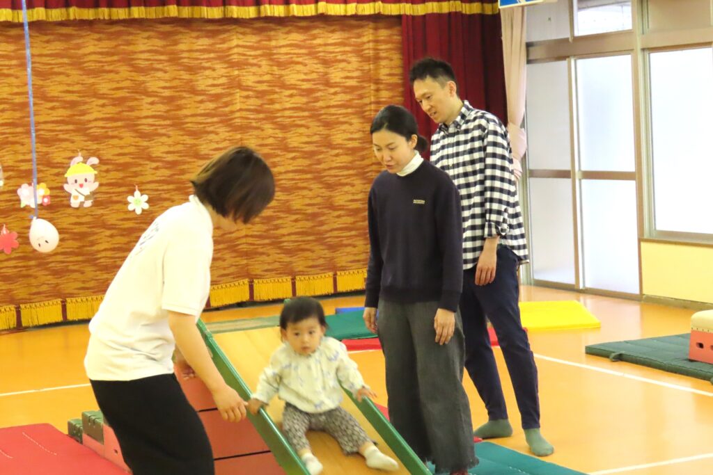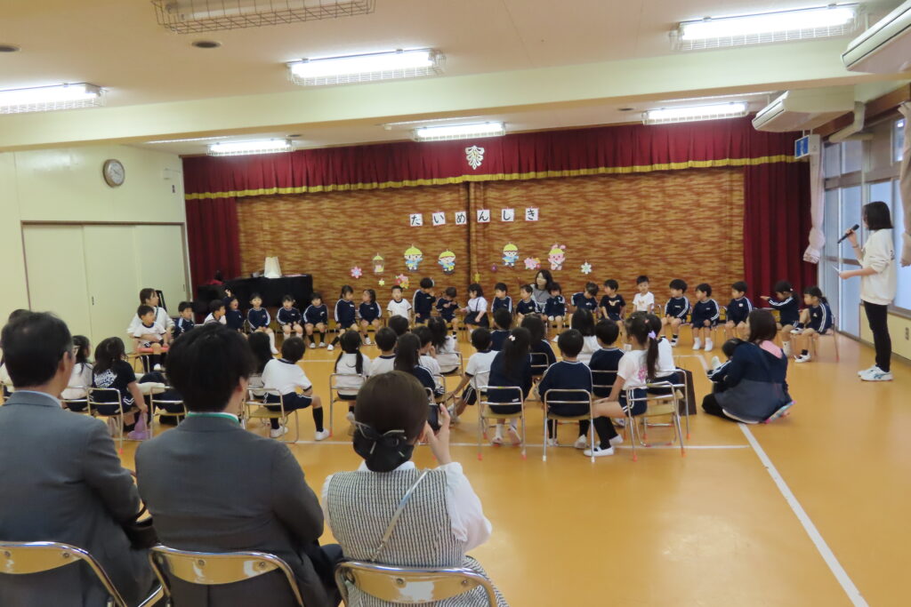まずは、昨日の対面式の様子からご紹介します。対面式では、入園式でご欠席されたお子様のご家族にも来ていただき、お子様の様子を見ていただきました。