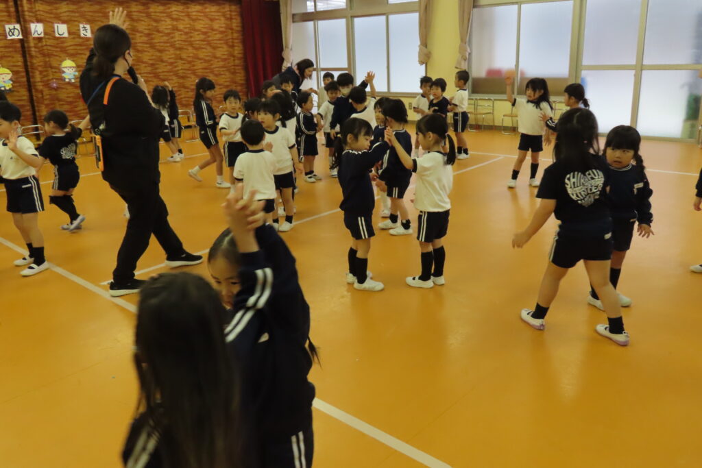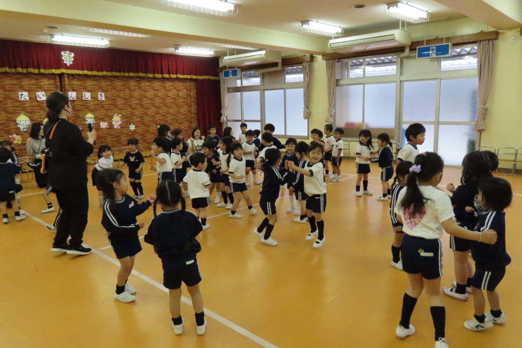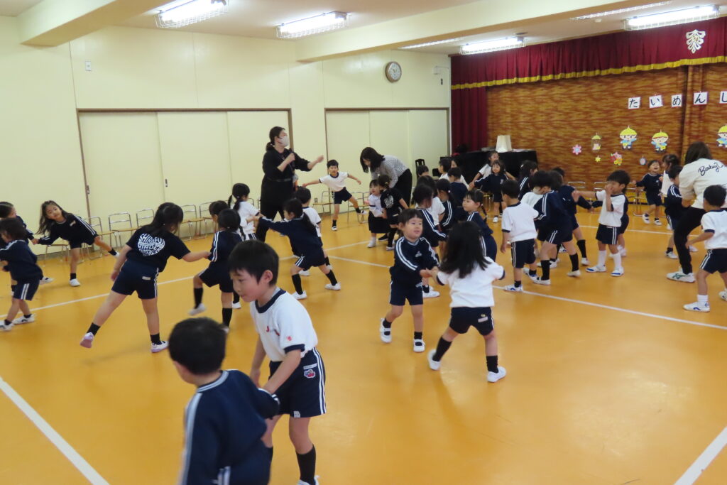 全員の紹介が終わると、ふれあい遊びです。「ゆうえんちであそぼう」の曲に合わせて違う学年のお友だちとペアになって楽しみました。