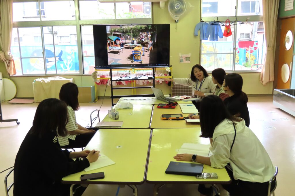 今年から始まった取組の一つに、奈良保育学院の先生による職員研修があります。第3水曜日を除く毎水曜日、学院の先生に午前中の子どもたちや先生の様子を見ていただき、降園後の時間を少し使ってプチ研修を行います。今日はその2回目。子どもたちの様子や先生のかかわり方、園庭の環境などについて、子どもたちがより良い環境のなかで、より良い活動ができるように話し合いをしました。