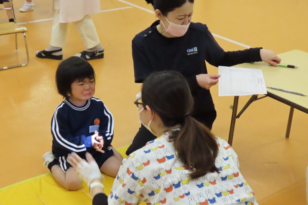 年長さんの後の年少さんは「やはり…」というべきか『お医者さんに診てもらう』というだけで怖い気持ちになるのか、泣き出してしまう子も…。待っているときから不安感いっぱいのドキドキ感が伝わってきます。年長さんとの2年間の違いは、やっぱり大きいなあと実感しました。