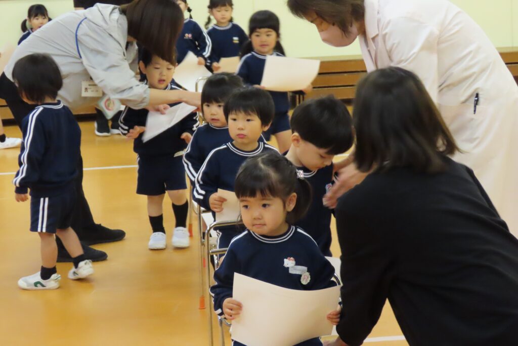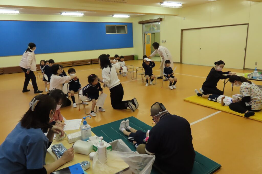 年中さんからは、ちょっと不安な気持ちもあるけれど「泣かずにがんばる!」という気持ちが伝わってきました。順番を待っている姿からも「だいじょうぶかな…。痛くないよね…。」という思いが伝わってきます。