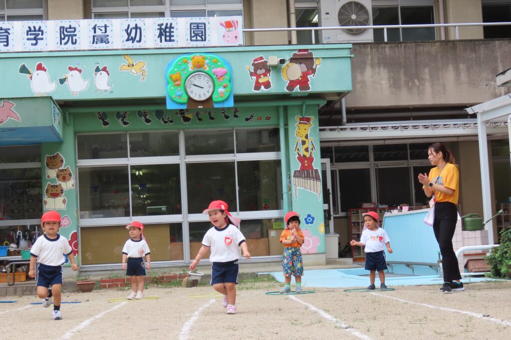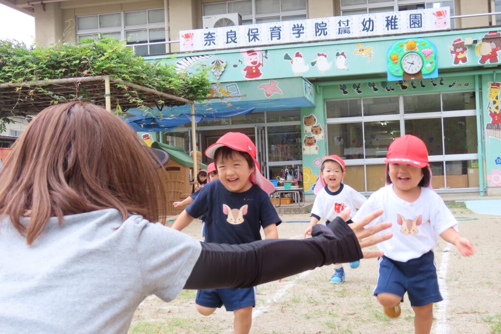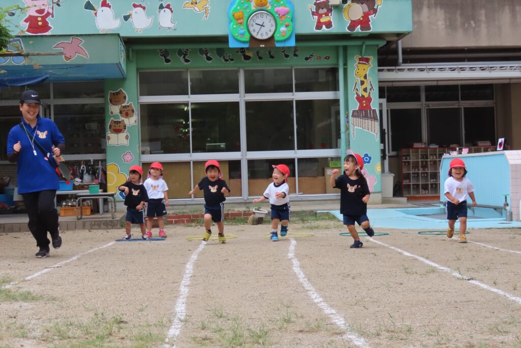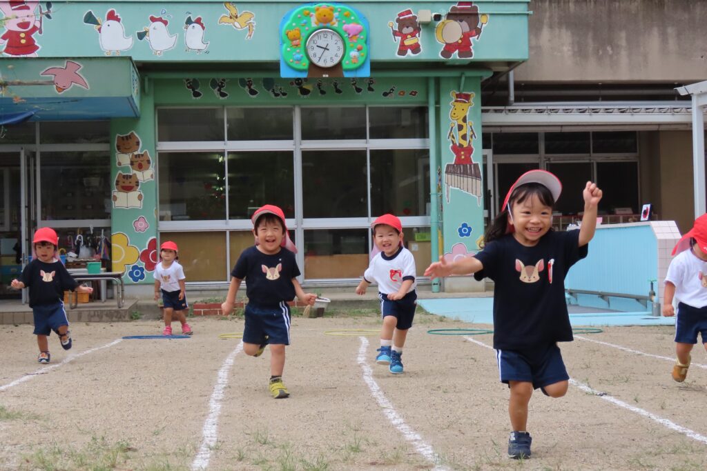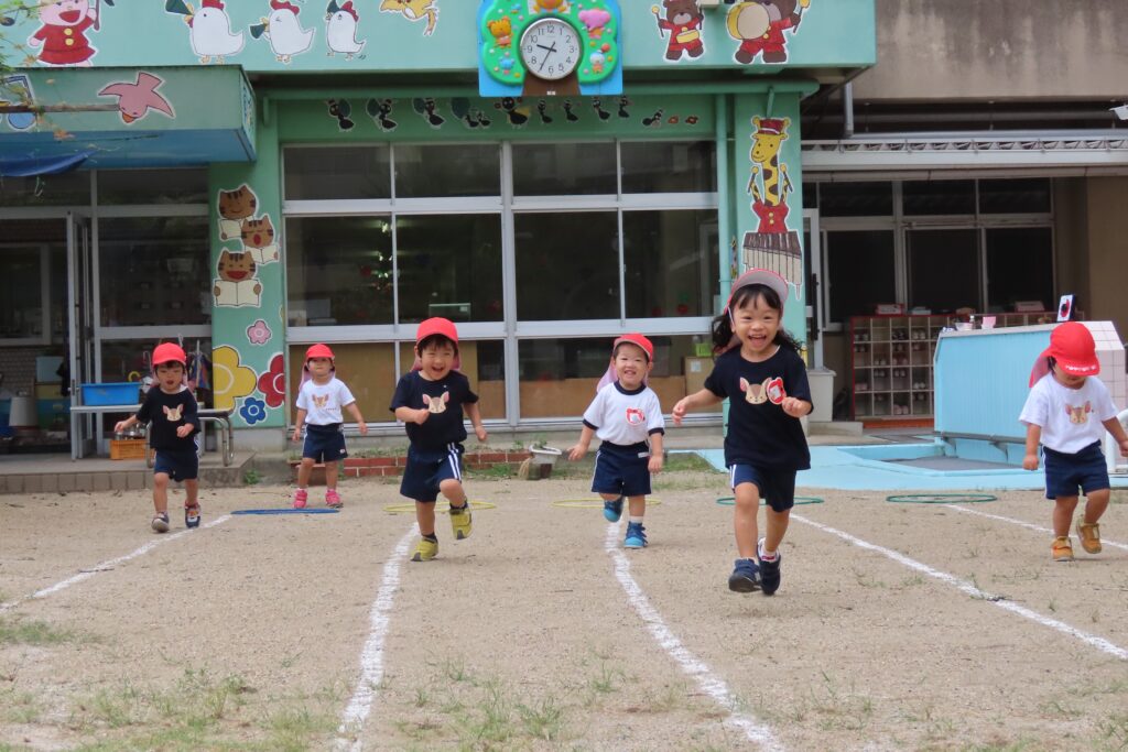 今日は2歳児・満3歳児クラス「りんご組」さんの外遊びの様子をご紹介します。はじめにかけっこです。