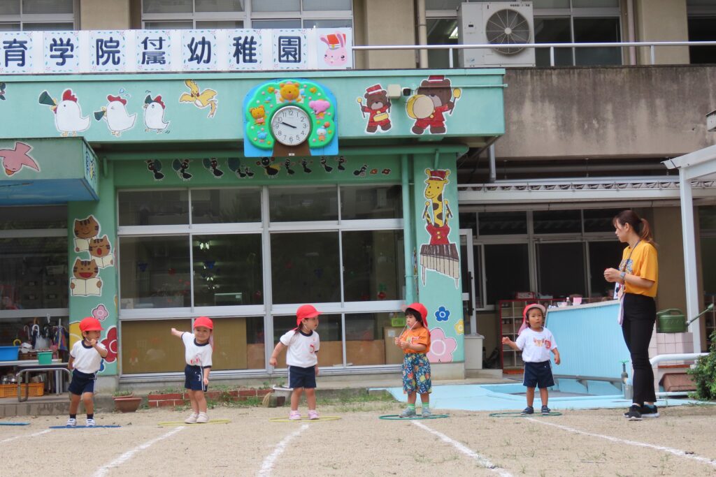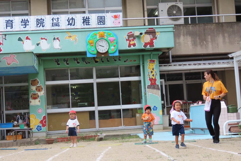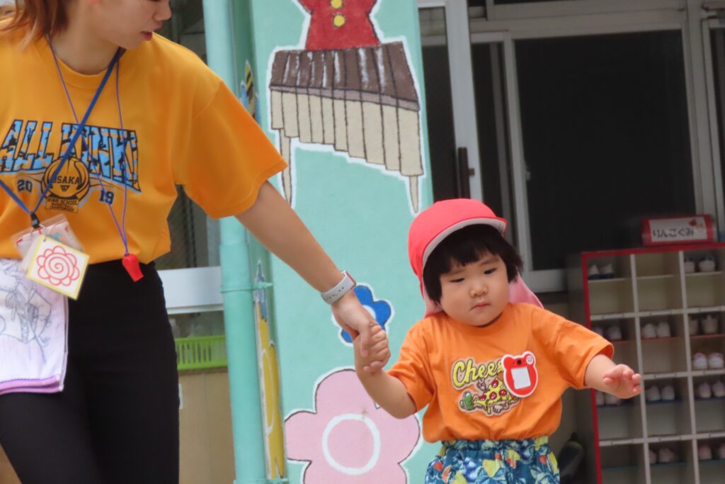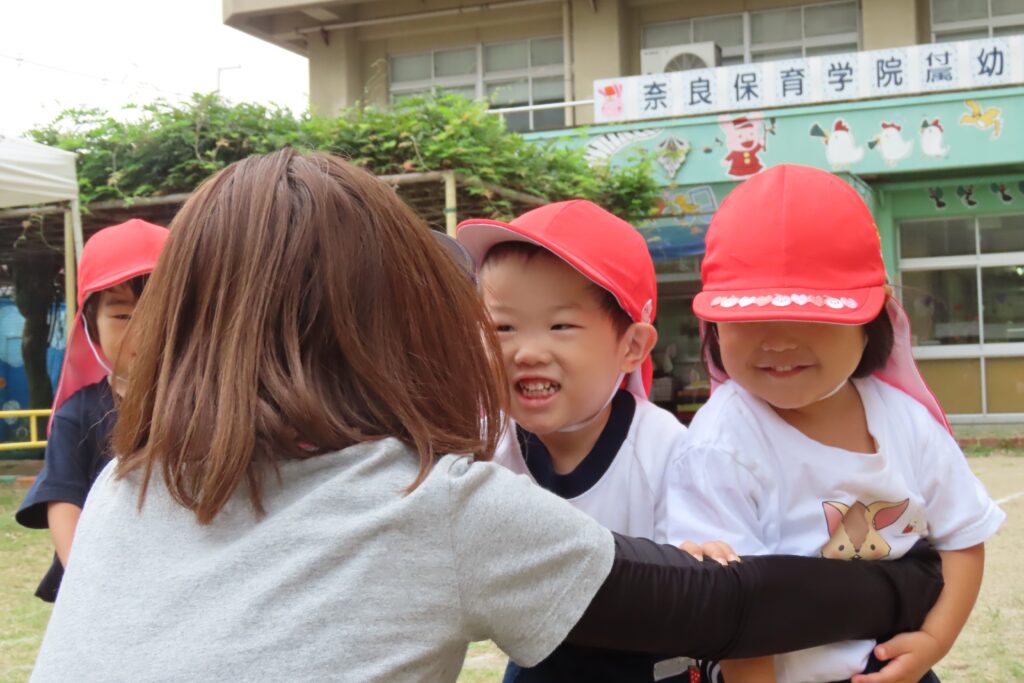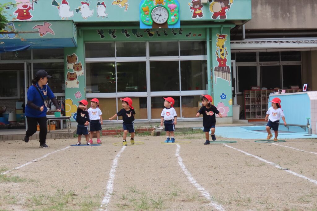 今日は2歳児・満3歳児クラス「りんご組」さんの外遊びの様子をご紹介します。はじめにかけっこです。