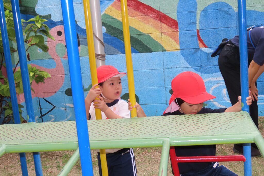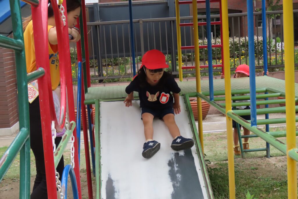 かけっこの後は遊具や砂場で…。本園自慢のジャングラミング(ジャングルジムや登降棒、滑り面、雲梯が一緒になった総合体育遊具)も「りんご組」さんは真ん中の滑り台までで遊びます。3歳「さくら組」さんになったら、上まで登って遊ぼうね。