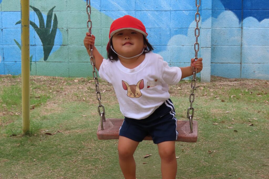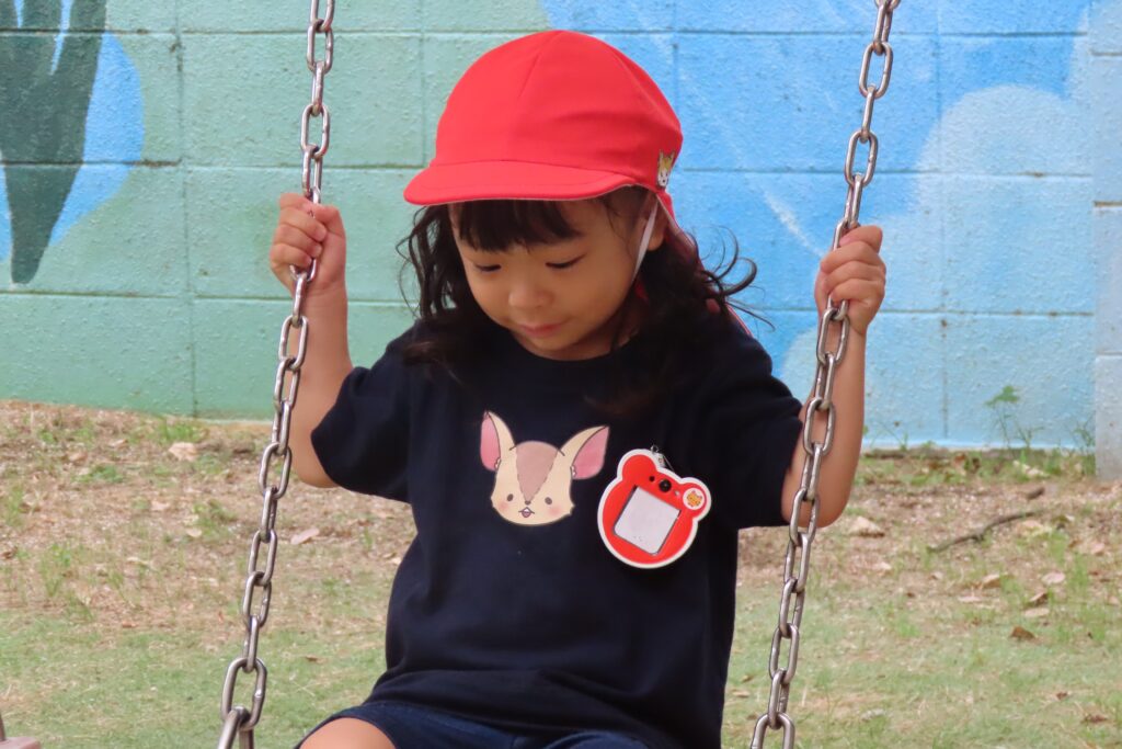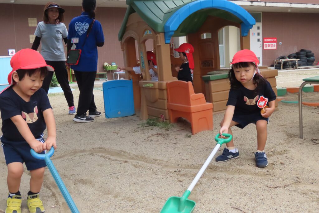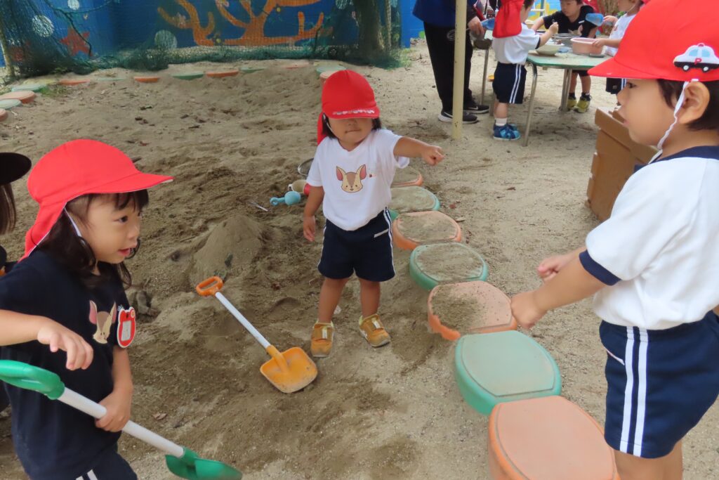 本園の運動会は10月26日ですが、りんご組さんは10月28日(火)です。まだまだ1か月も先の話ですが、3歳児以上が運動会ごっこで遊んでいると「ぼくも、わたしも…!」となるのかな?園庭にコースを作って楽しみました。(画像をアップすると、一人ひとりの嬉しそうな顔がよくわかります!)