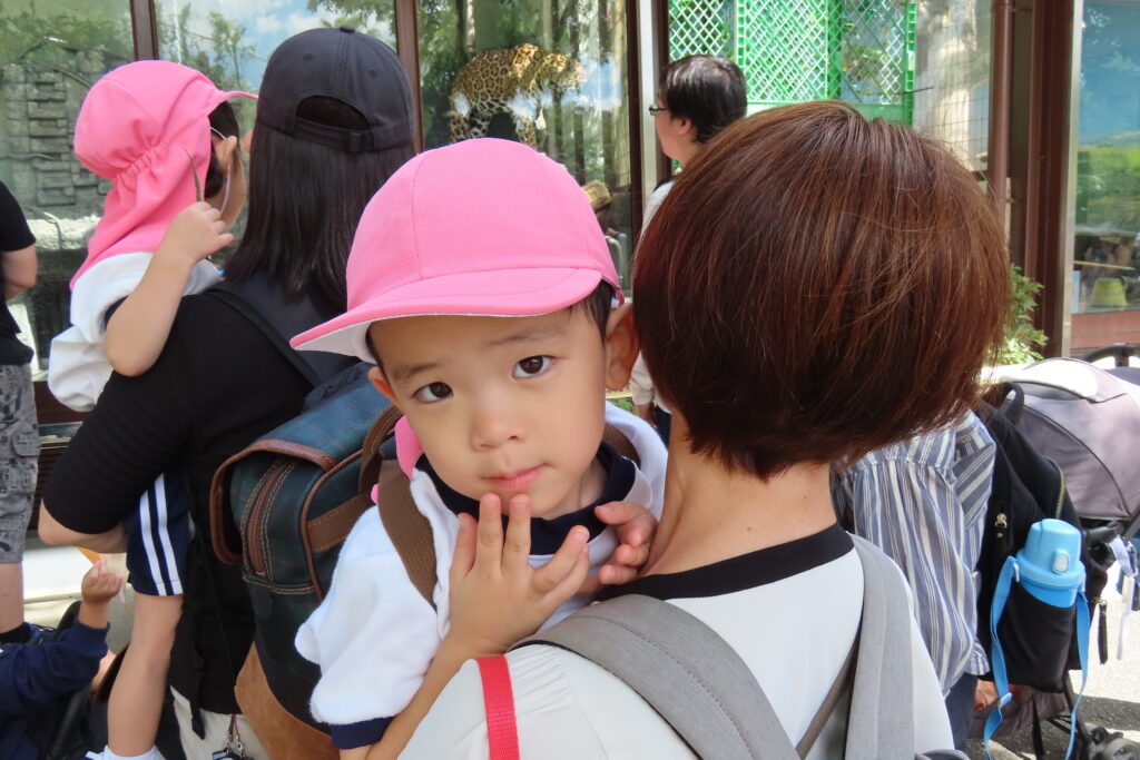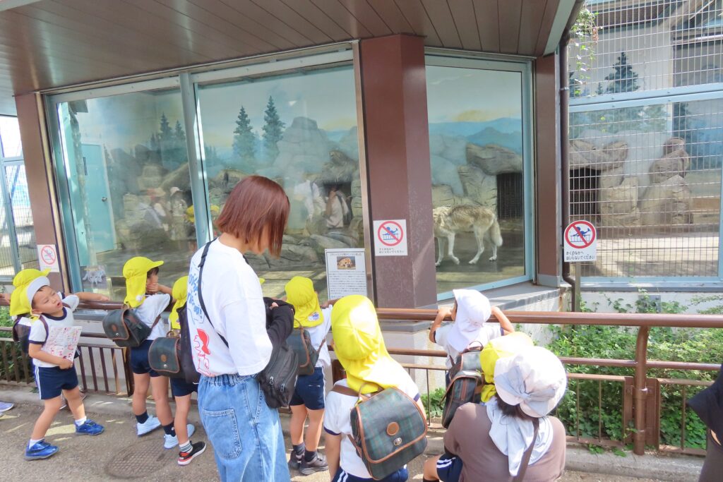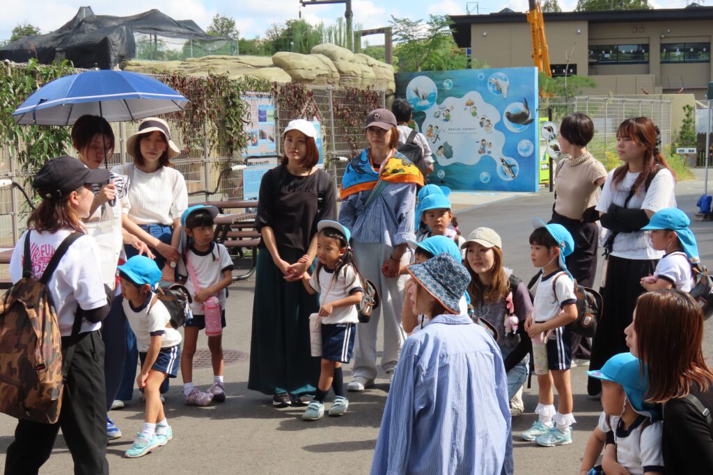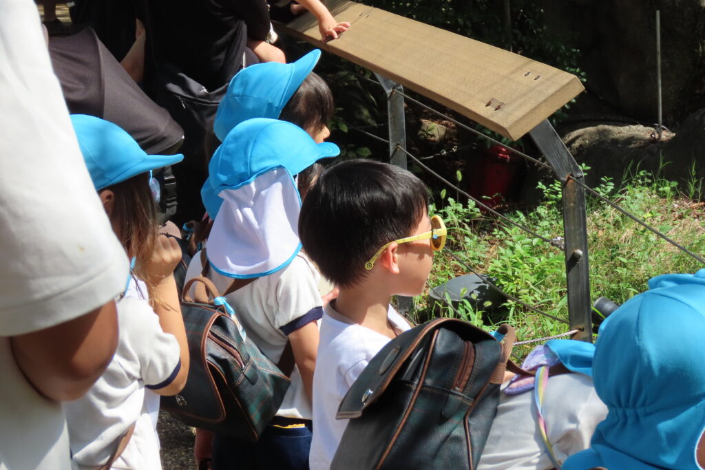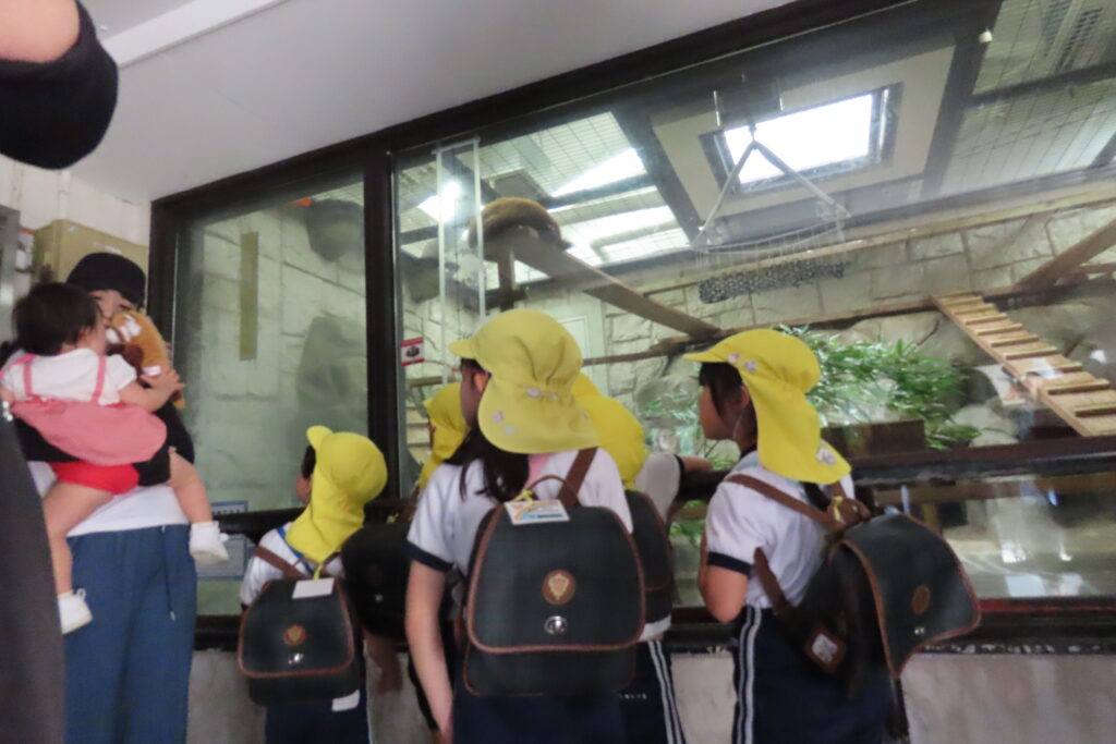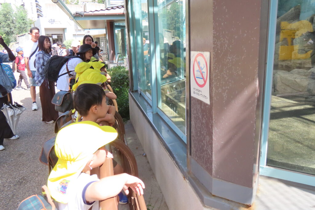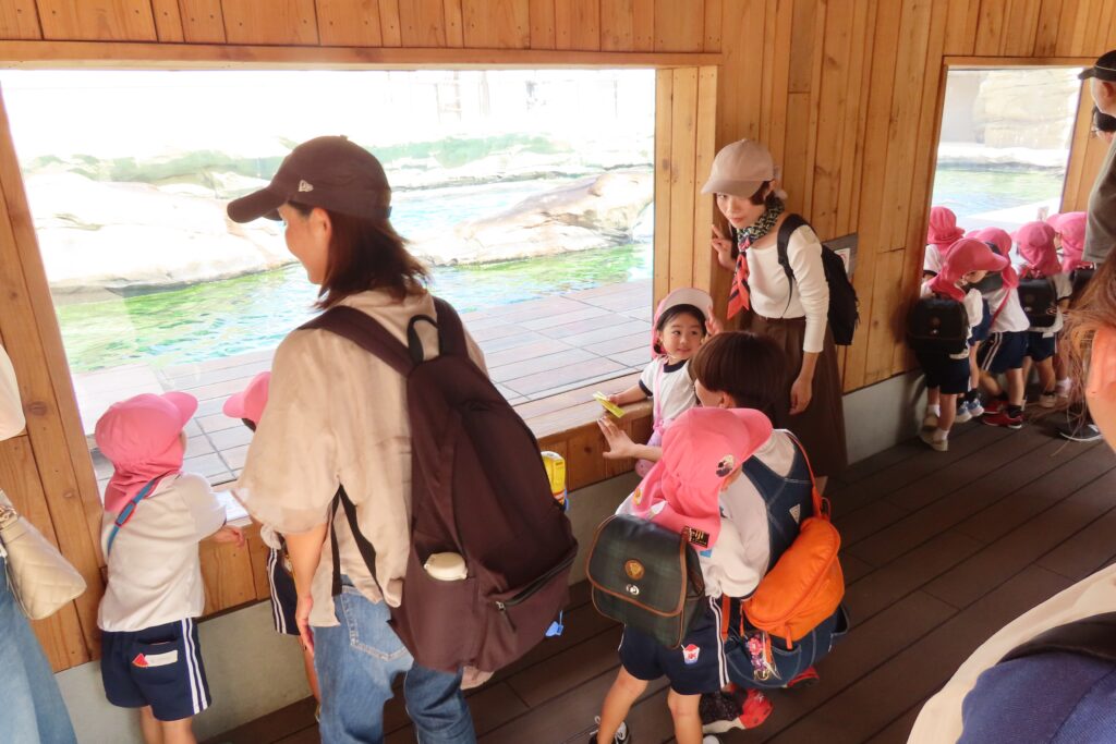入園後、午前中はクラス行動です。それぞれお目当ての動物(生き物)がいて、年長「つき組」さんは〈ペンギン・レッサーパンダ・オオカミ〉で、年中「ほし組」さんは〈ペンギン・しろくま・チンパンジー〉、年少「さくら組」さんは〈へび・とり・レッサーパンダ〉です。