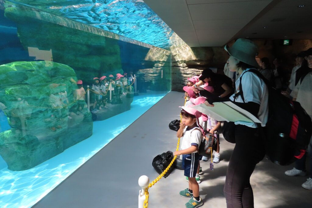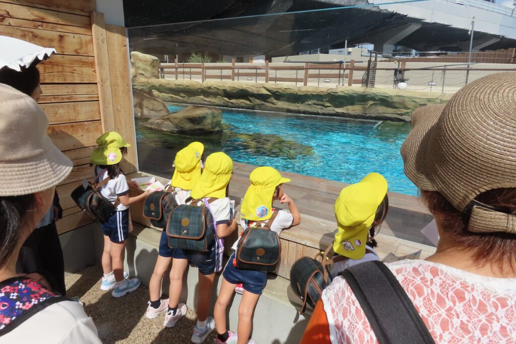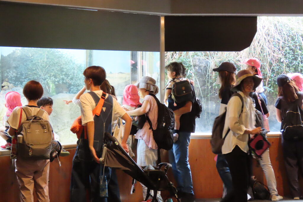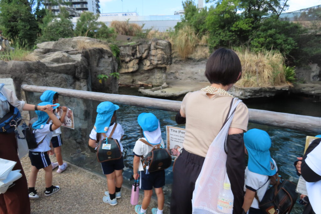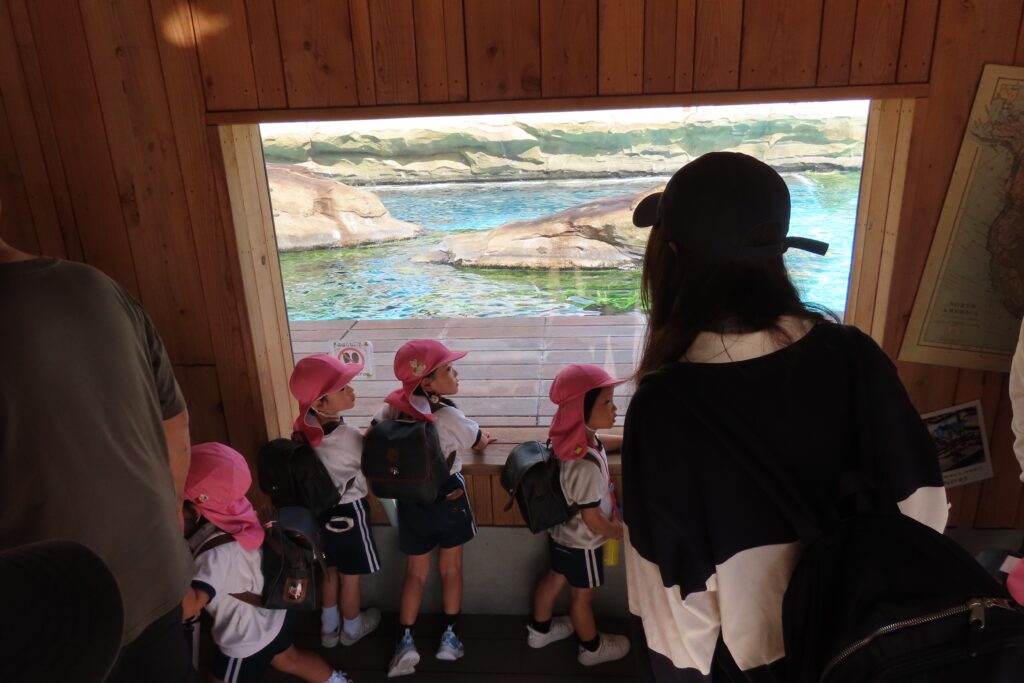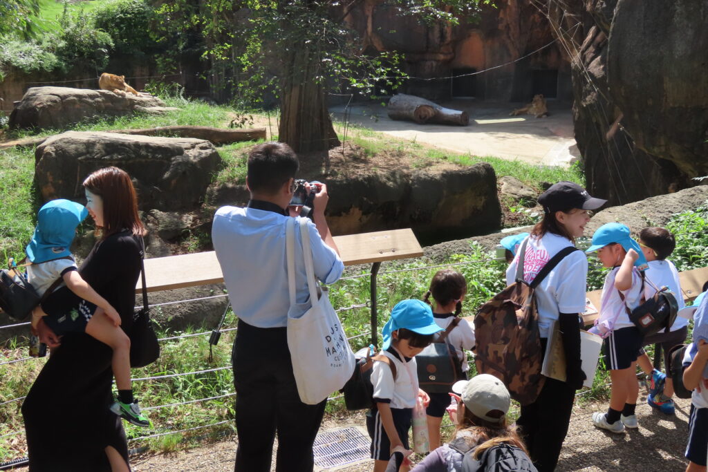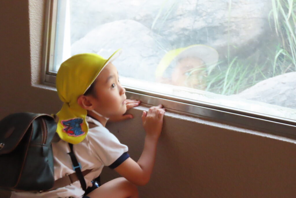入園後、午前中はクラス行動です。それぞれお目当ての動物(生き物)がいて、年長「つき組」さんは〈ペンギン・レッサーパンダ・オオカミ〉で、年中「ほし組」さんは〈ペンギン・しろくま・チンパンジー〉、年少「さくら組」さんは〈へび・とり・レッサーパンダ〉です。