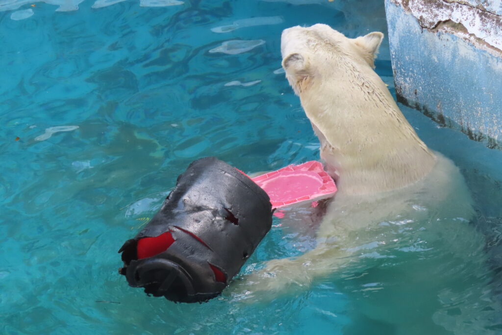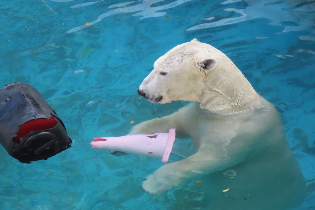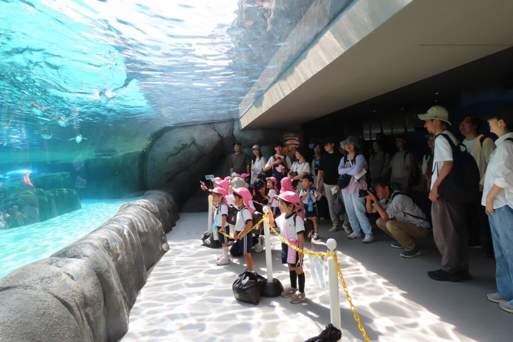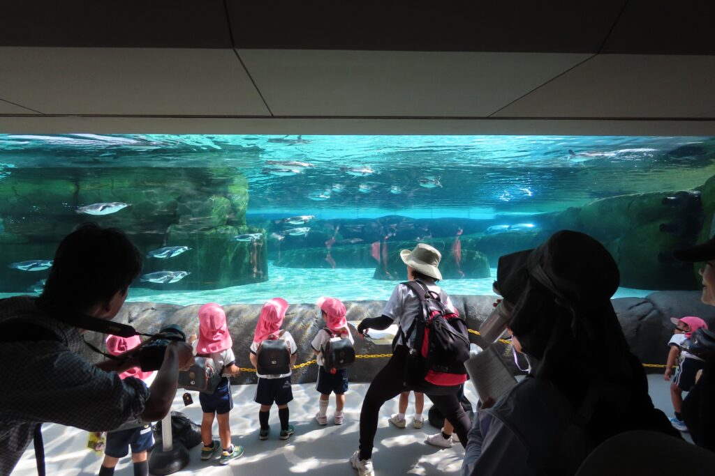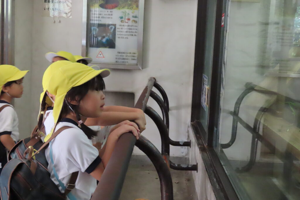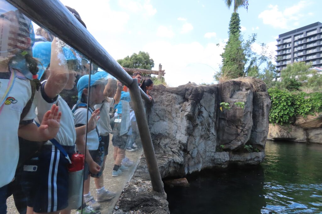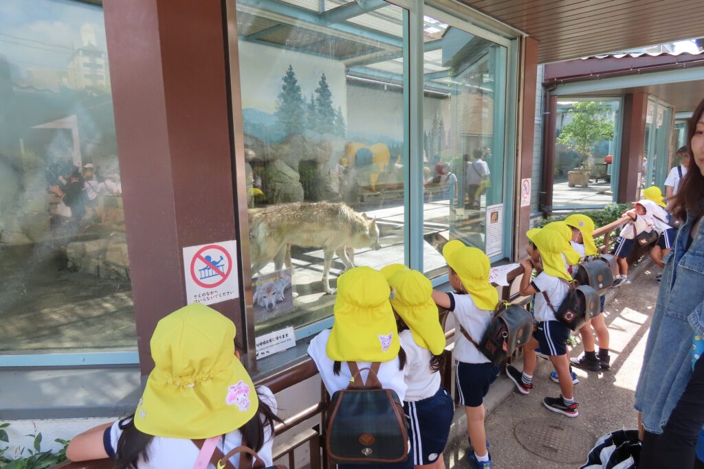 入園後、午前中はクラス行動です。それぞれお目当ての動物(生き物)がいて、年長「つき組」さんは〈ペンギン・レッサーパンダ・オオカミ〉で、年中「ほし組」さんは〈ペンギン・しろくま・チンパンジー〉、年少「さくら組」さんは〈へび・とり・レッサーパンダ〉です。